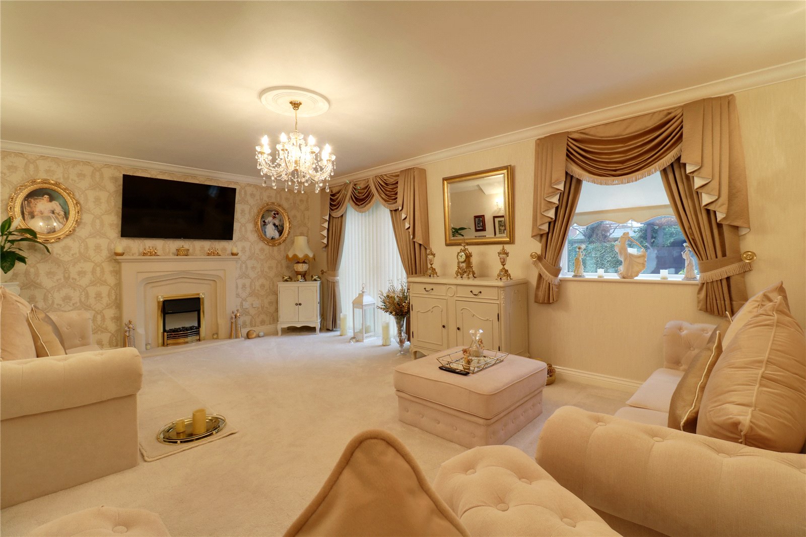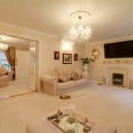 Dimensions: 5.8m x 3.76m. With a rear double glazed window, French doors allowing access to the rear garden, wall to ceiling coving, three double wall lights, TV input and a feature electric coal effect fireplace with sandstone type hearth, matching surround, mantel and hearth.