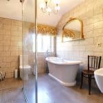 Rear uPVC double glazed window with patterned glazing, enjoys a luxury suite in white comprising a low flush WC, pedestal wash hand basin, rolled top free standing bath with shower attachment, walk through shower with mains shower and glazed screen, tiled flooring, tiling to walls, fitted chrome towel rail and large ceiling rose.
