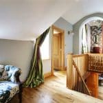 Has rear uPVC double glazed windows, French doors leading to the raised decked balcony, continuation of handsome oak balustrading with matching flooring, original fitted storage cupboard and drawer units being felt lined, wall to ceiling coving, ceiling rose and leads to;