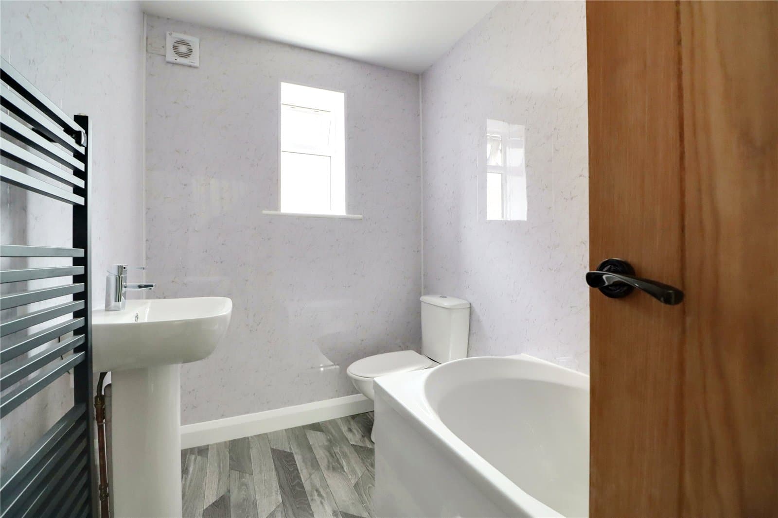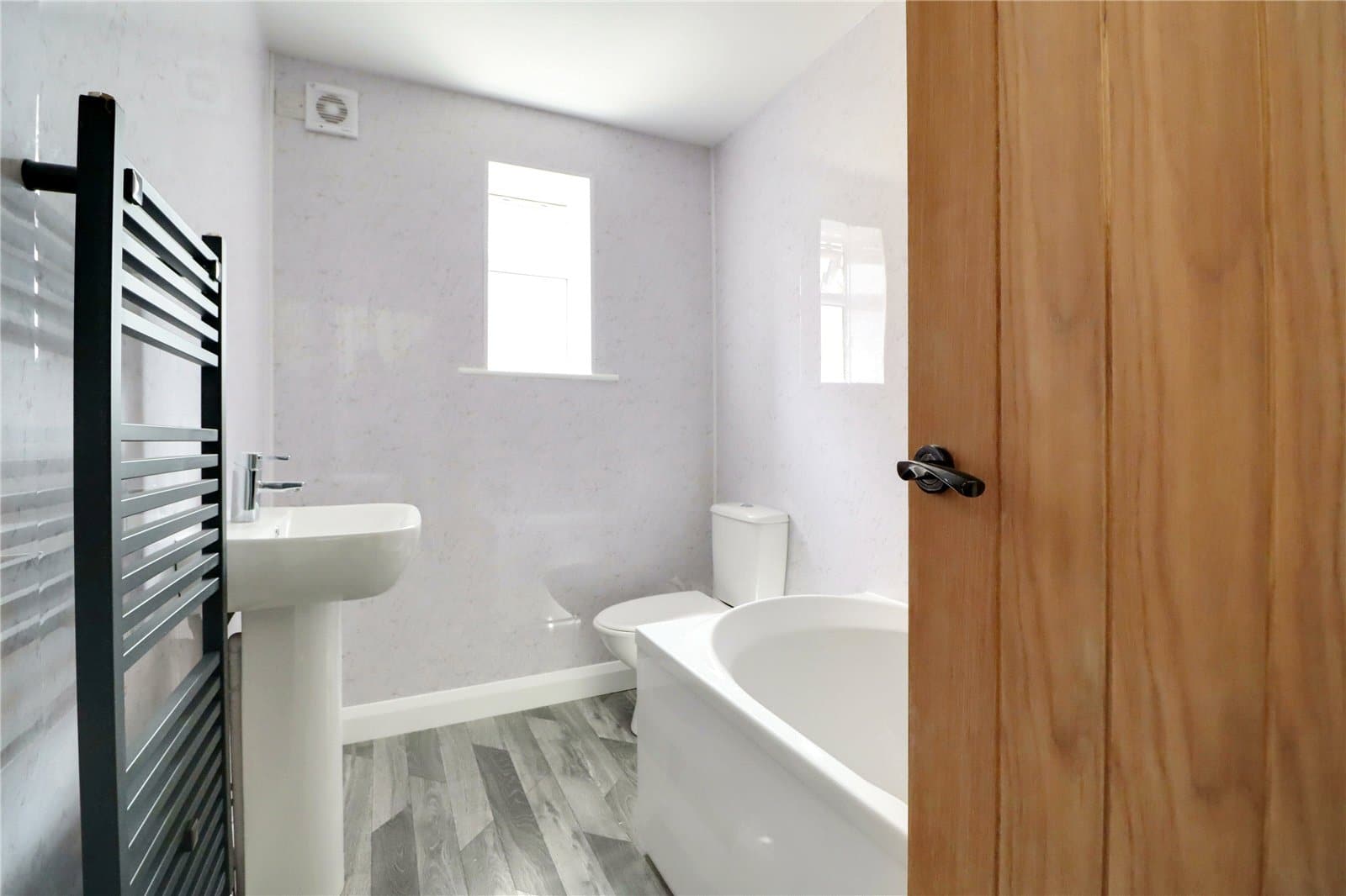 Side uPVC double glazed window with patterned glazing providing a modern three piece suite in white comprising a low flush WC, pedestal wash hand basin, panelled bath with mains shower over and glazed screen, cushioned flooring, mermaid boarding to walls and modern towel rail.