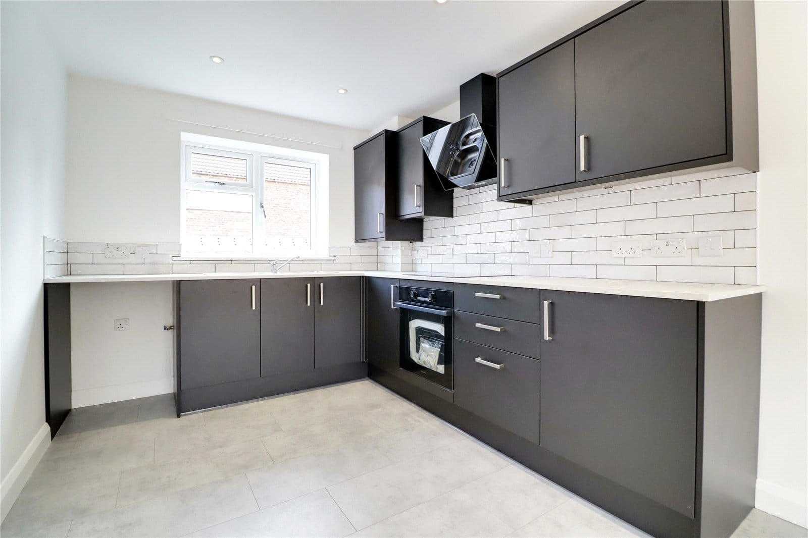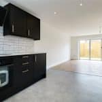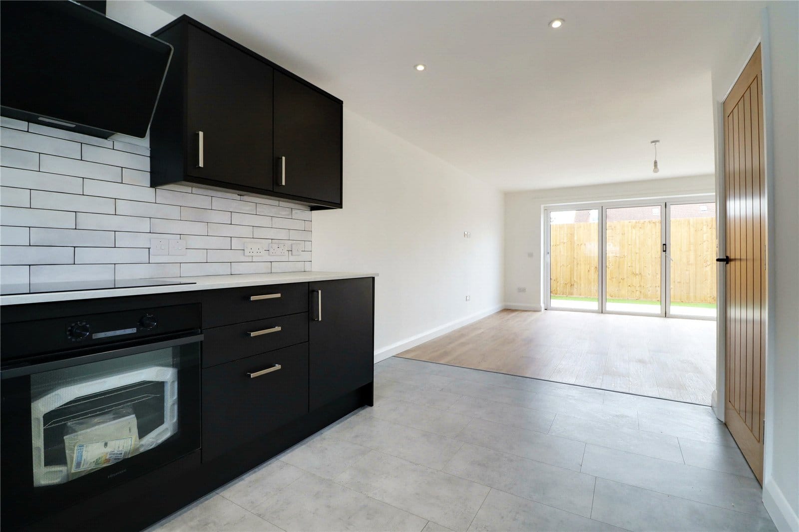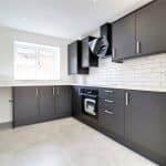Front uPVC double glazed window, generously fitted with contemporary furniture with brushed aluminium style pull handles enjoying a marble style worktop with tiled splash backs incorporating a one and a half bowl stainless steel sink unit with drainer to the side and block mixer tap, built-in four ring induction hob with oven beneath and overhead extractor, inset ceiling spotlights, space for appliances, tiled flooring and open access through to;