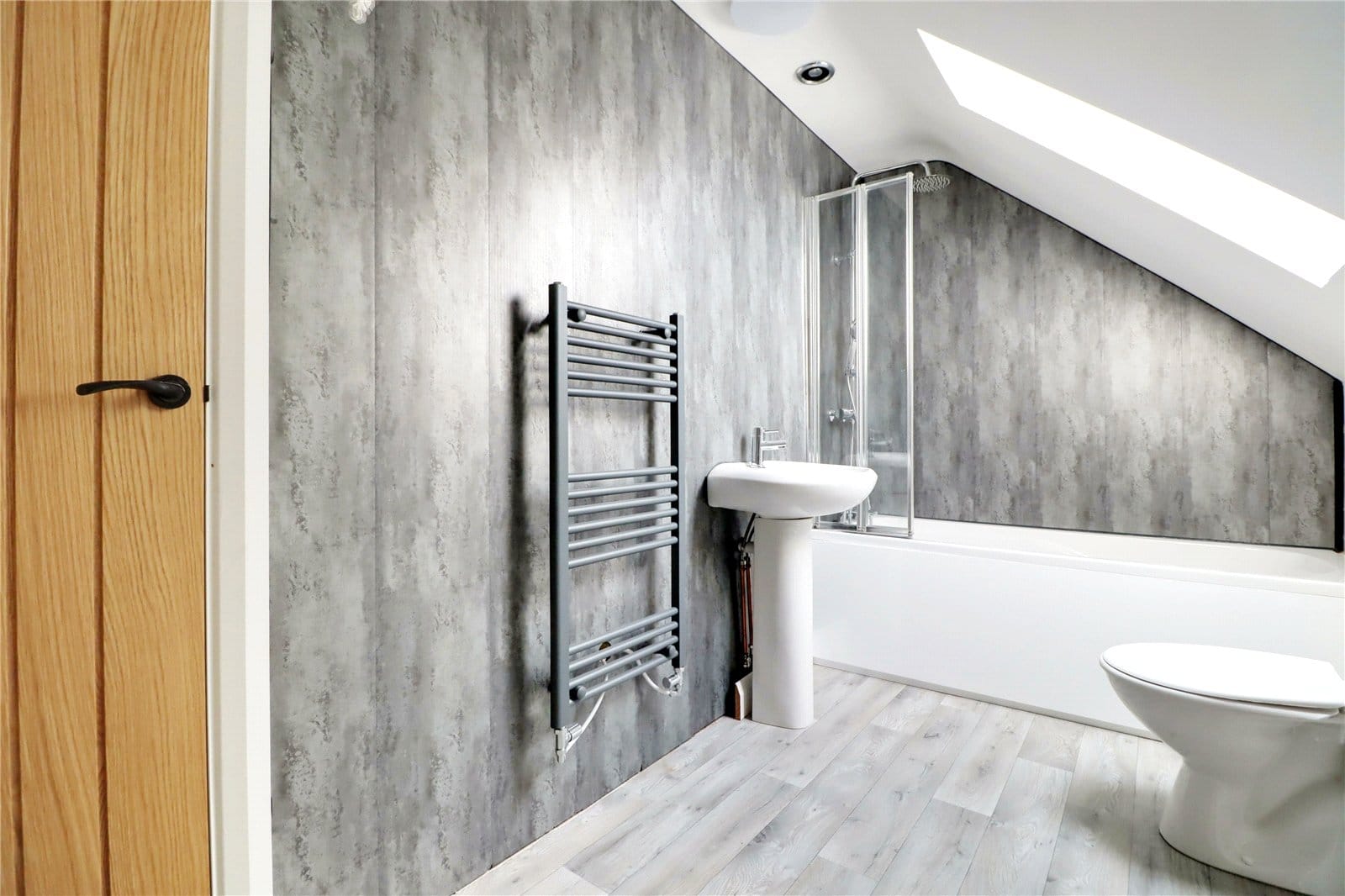 Rear double glazed roof light, modern suite in white comprising a low flush WC, pedestal wash hand basin, panelled bath with mains shower over and glazed screen, cushioned flooring, part mermaid boarding to walls with modern towel rail, eaves storage and oak door leads to a large fitted storage cupboard.