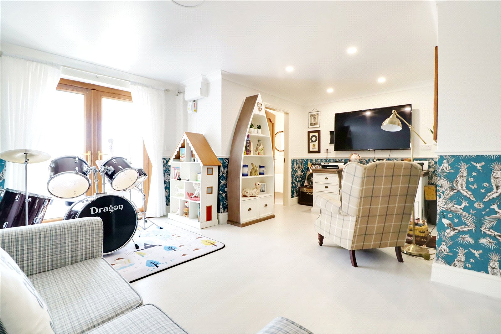 Front woodgrain effect uPVC double glazed window, wall to ceiling coving, inset ceiling spotlights, doors through to an en-suite bathroom and open access through to bedroom 5.