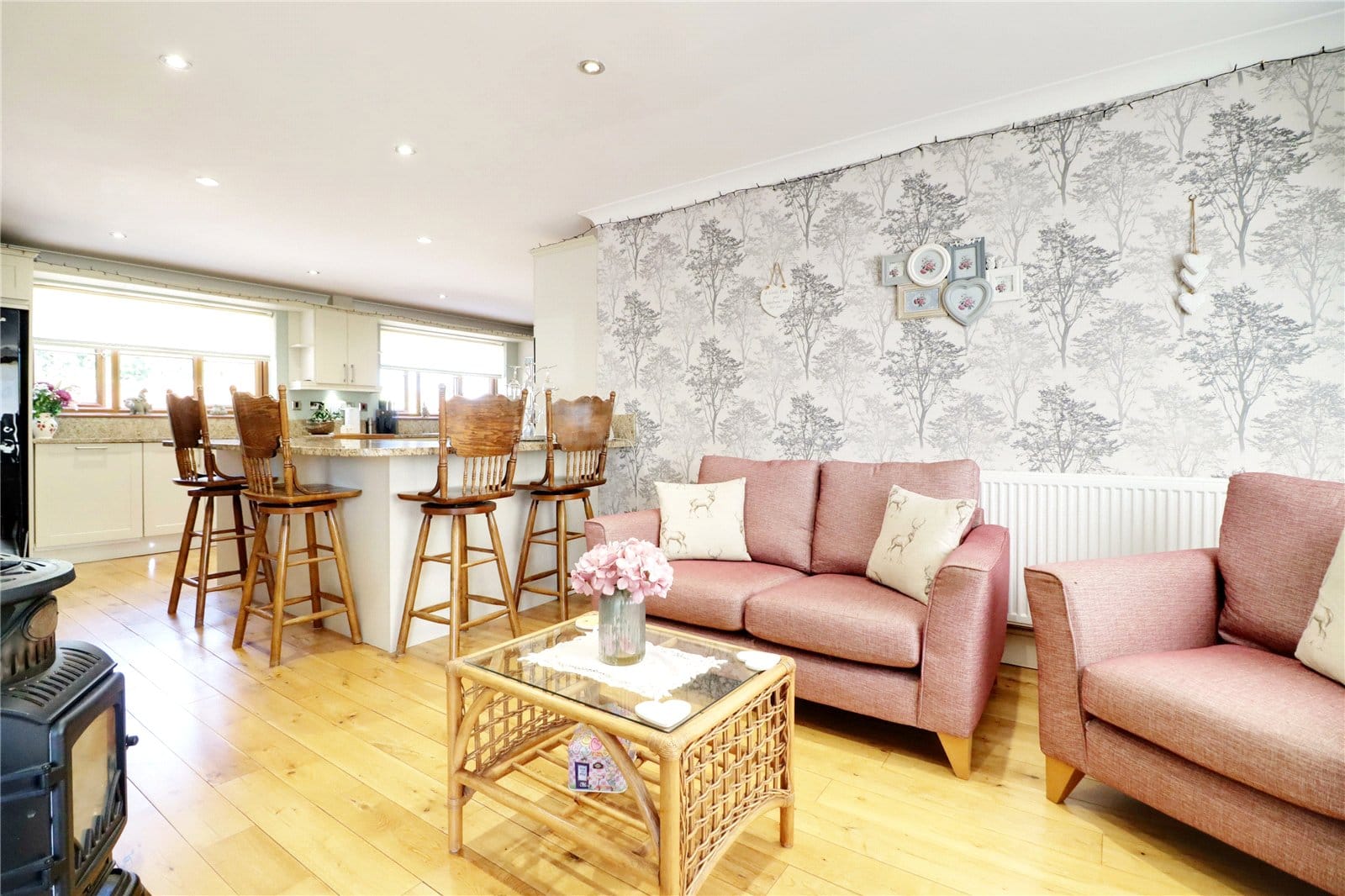 With internal woodgrain effect uPVC double glazed windows leading through to the conservatory, attractive light finished laminate flooring, dado railing, wall to ceiling coving, inset spotlights and doors through to;