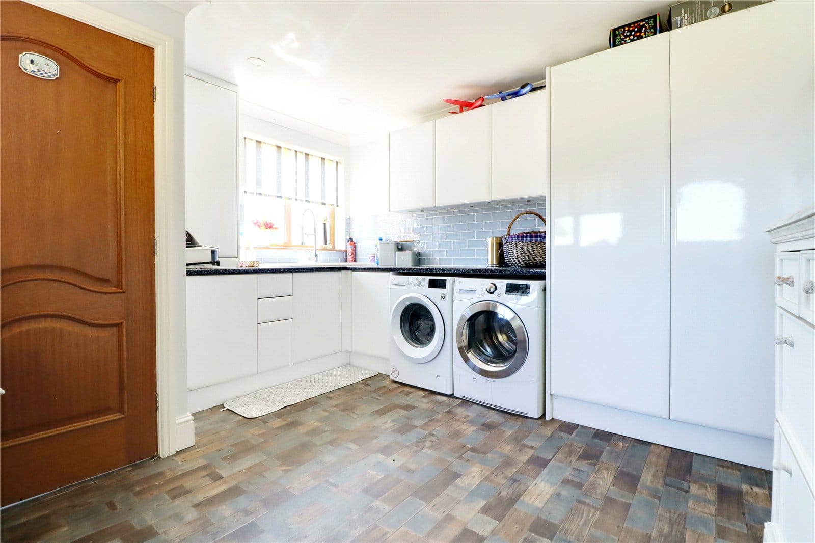 Enjoying front and rear woodgrain effect uPVC double glazed windows, broad opening to the formal dining room and attractive solid wooden flooring, The kitchen enjoys a bespoke and extensive range of shaker style furniture with brushed aluminium style pull handles with corner fitted larder, space and plumbing for appliances, and having a complementary worktop with matching uprising, incorporating a double bowl inset sink with etch drainer to the side quooker mixer tap, built-in five ring gas hob with overhead extractor and downlighting, eye level oven to either side with microwave and coffee machine, door leading through to the utility, wall to ceiling coving and inset ceiling spotlights.
