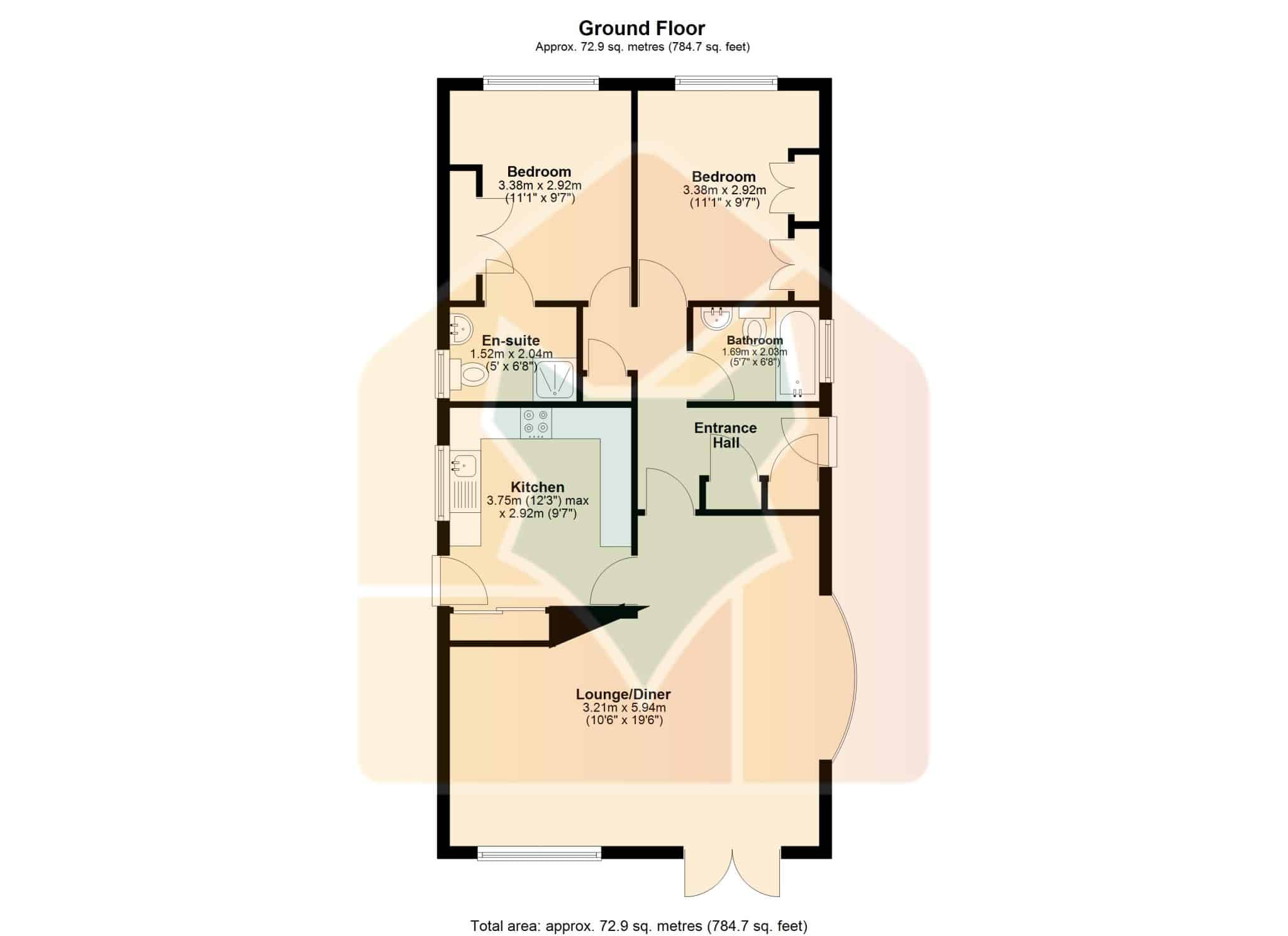 A welcoming entrance hall, an impressively proportioned lounge–diner offering dual-aspect light and ample space for relaxing and entertaining, a well-appointed fitted kitchen, two comfortable double bedrooms, and a bathroom suite. The master bedroom further benefits from its own private en-suite, adding a desirable touch of luxury.