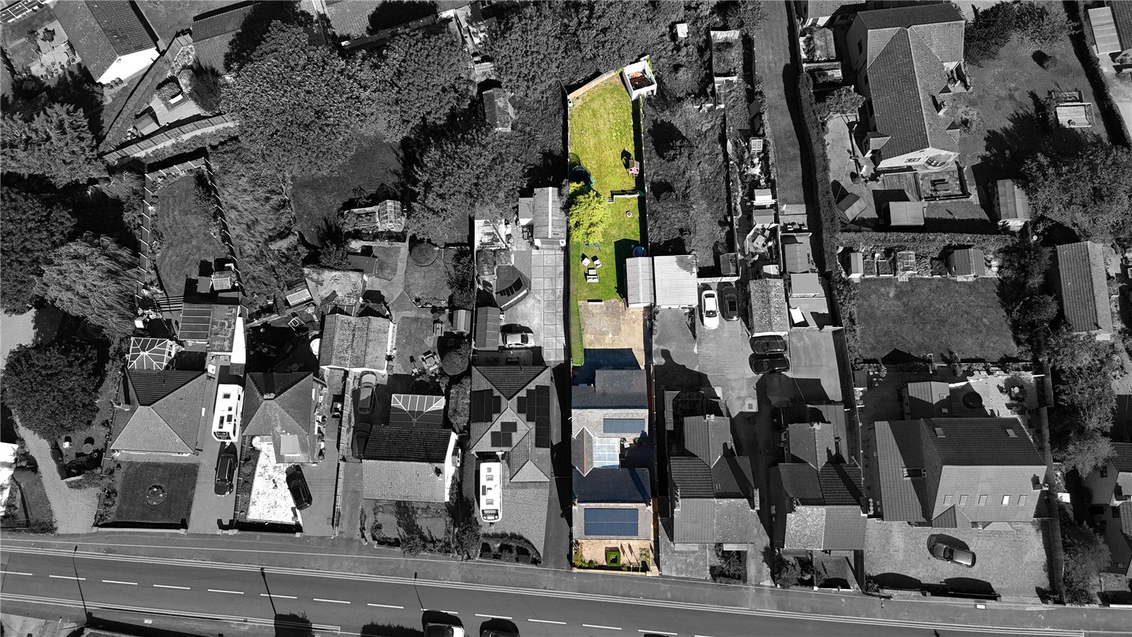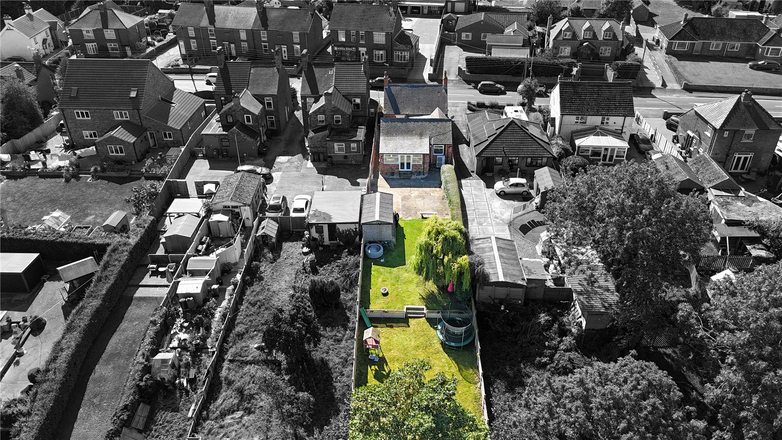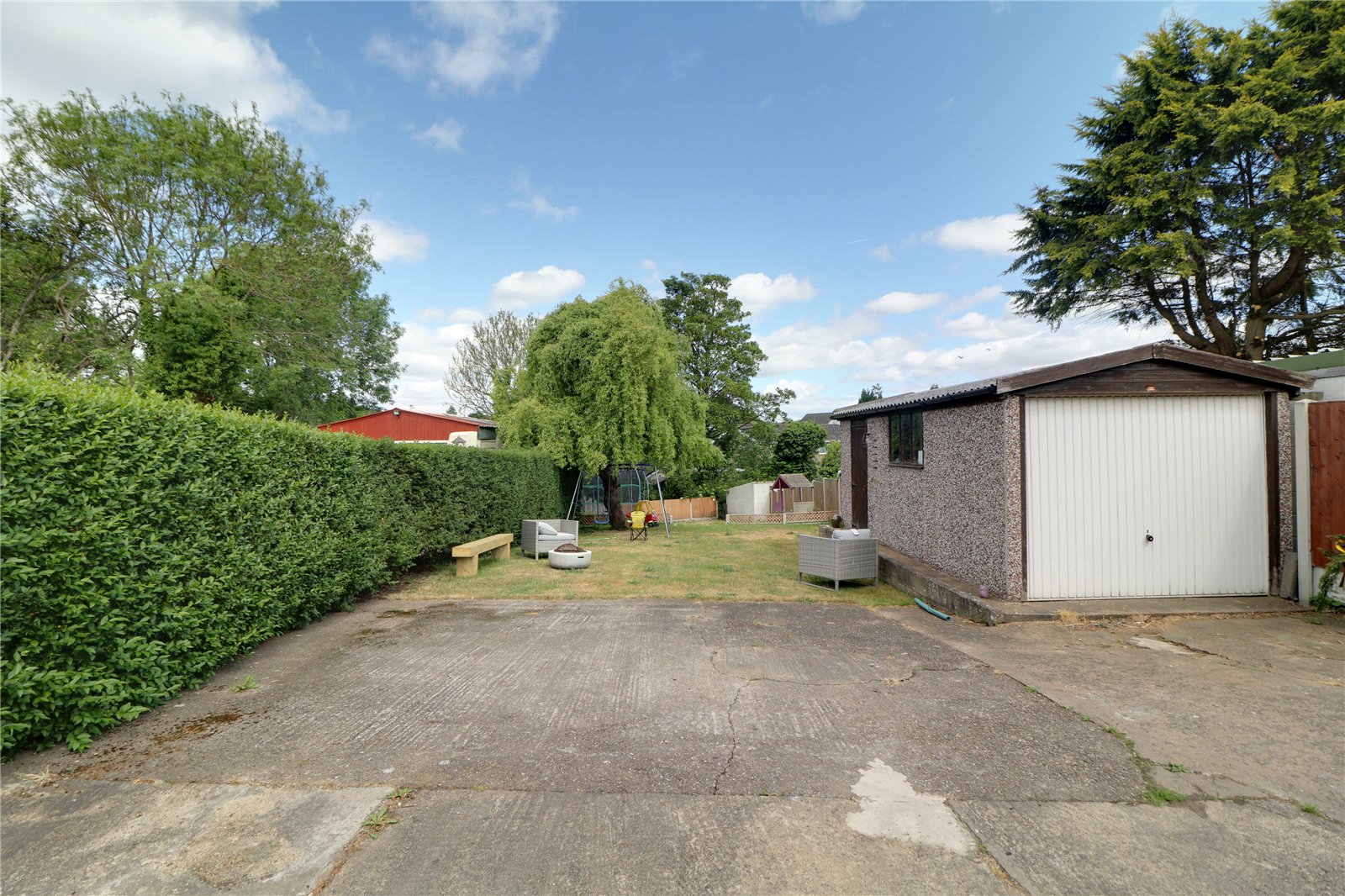 The property sits on a generous mature plot with shared driveway access via a hardstanding driveway with a detached concrete sectional garage to the rear. The rear of the property enjoys principally lawned split level gardens with surrounding fencing and boundary hedging.