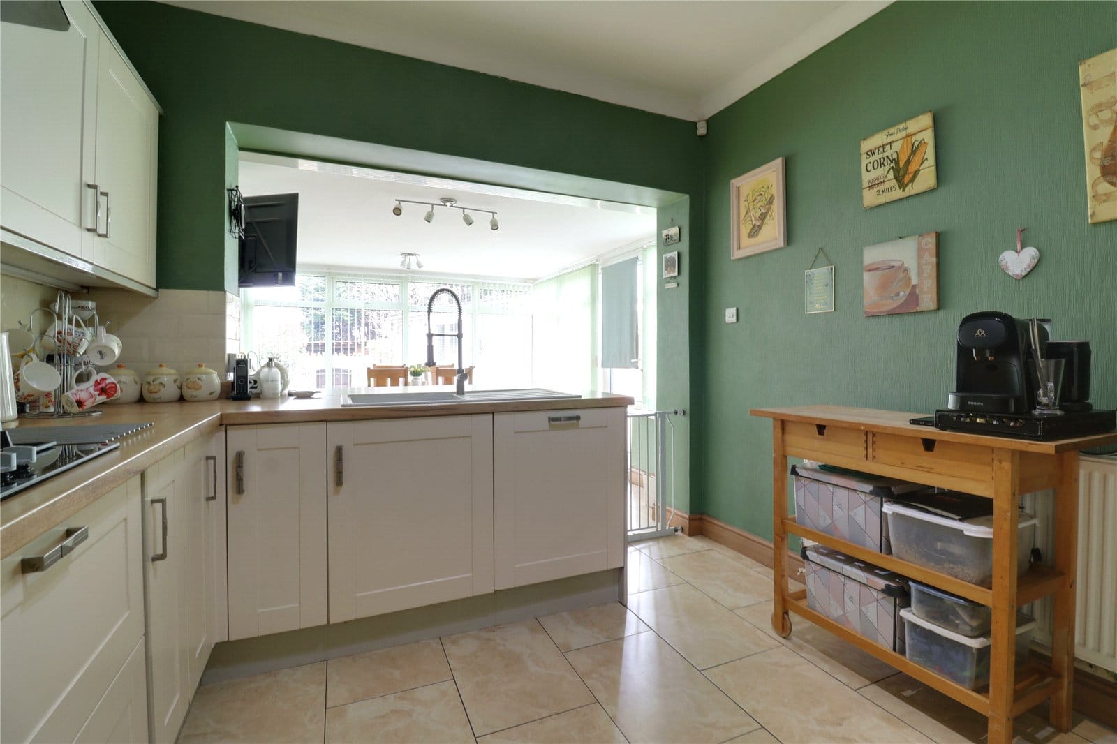 The extended and well proportioned accommodation briefly comprises an L-shaped entrance hall, a front-facing lounge with feature fireplace, and a modern fitted kitchen with integrated appliances opening into a dining area overlooking the rear garden. There are three good-sized bedrooms all served by a contemporary family bathroom.