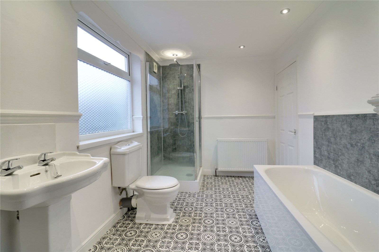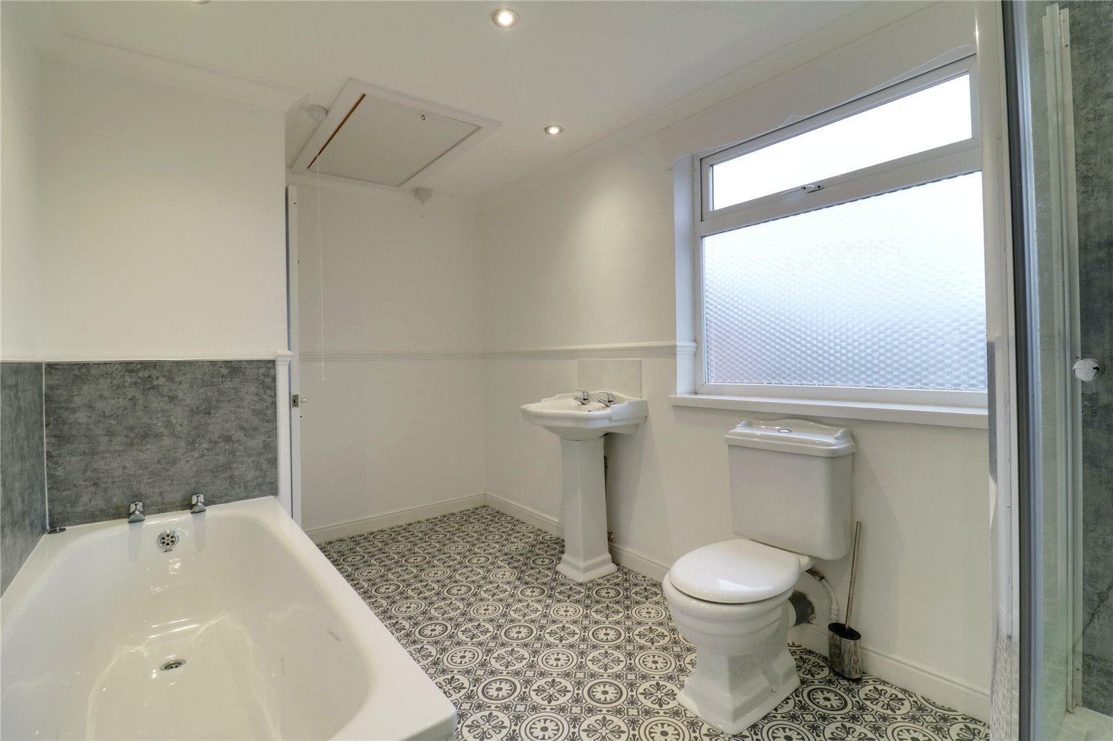 With a rear uPVC double glazed window, a four piece suite comprising a single walk-in shower cubicle with overhead chrome main shower with mermaid boarding splash back and glazed door, a low flush WC, pedestal wash hand basin and a fitted panelled bath with mermaid boarding splash back, attractive vinyl flooring, inset ceiling spotlights, loft access, extractor and an internal door leads through to an airing which has inset shelving.