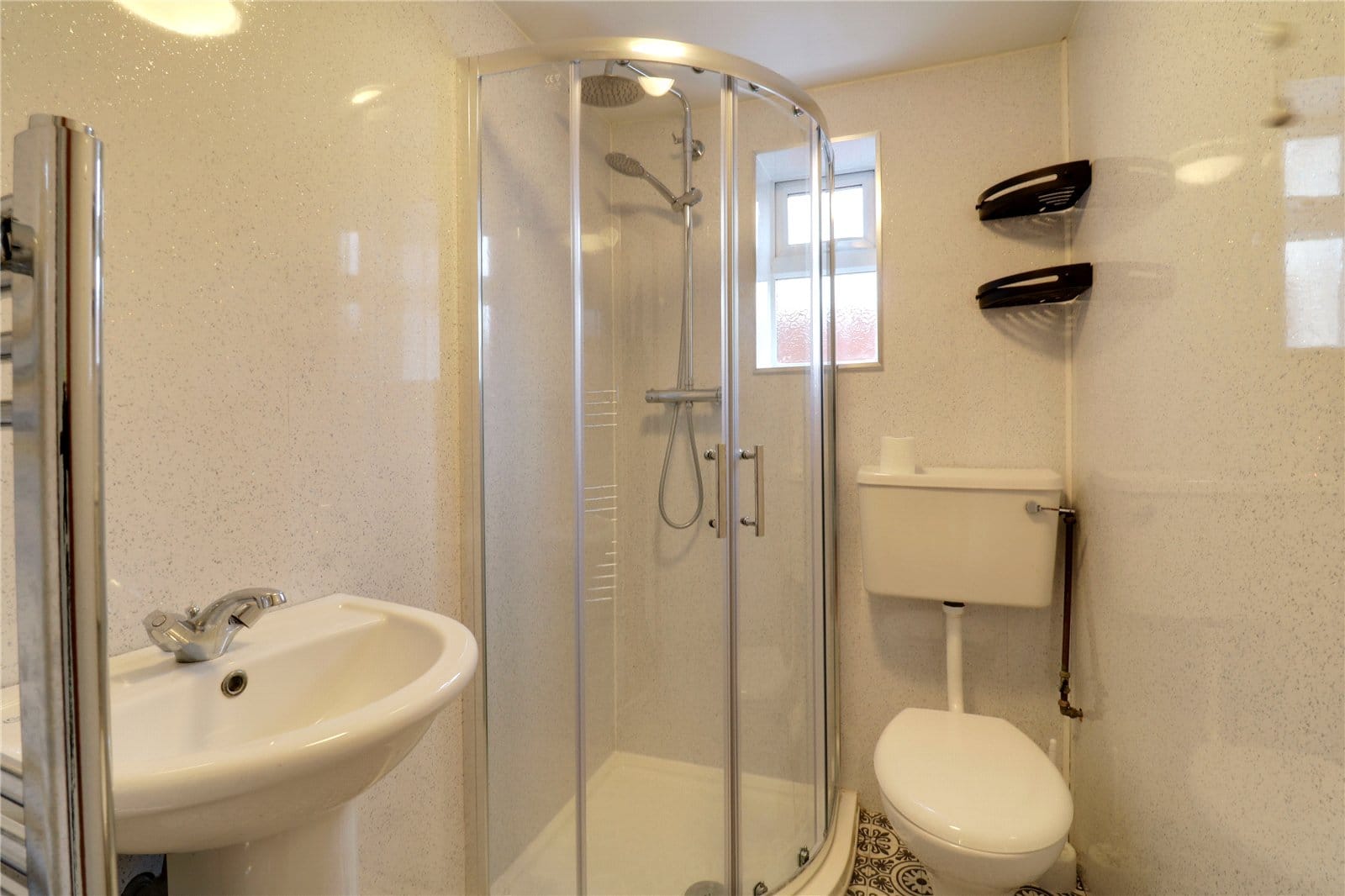 With a rear uPVC double glazed window with frosted glazing providing a three piece suite comprising a pedestal wash hand basin, a low flush WC and a corner walk-in shower cubicle with overhead chrome main shower, sliding twin main doors, mermaid boarding to the walls, vinyl flooring, chrome wall mounted towel heater and extractor fan.
