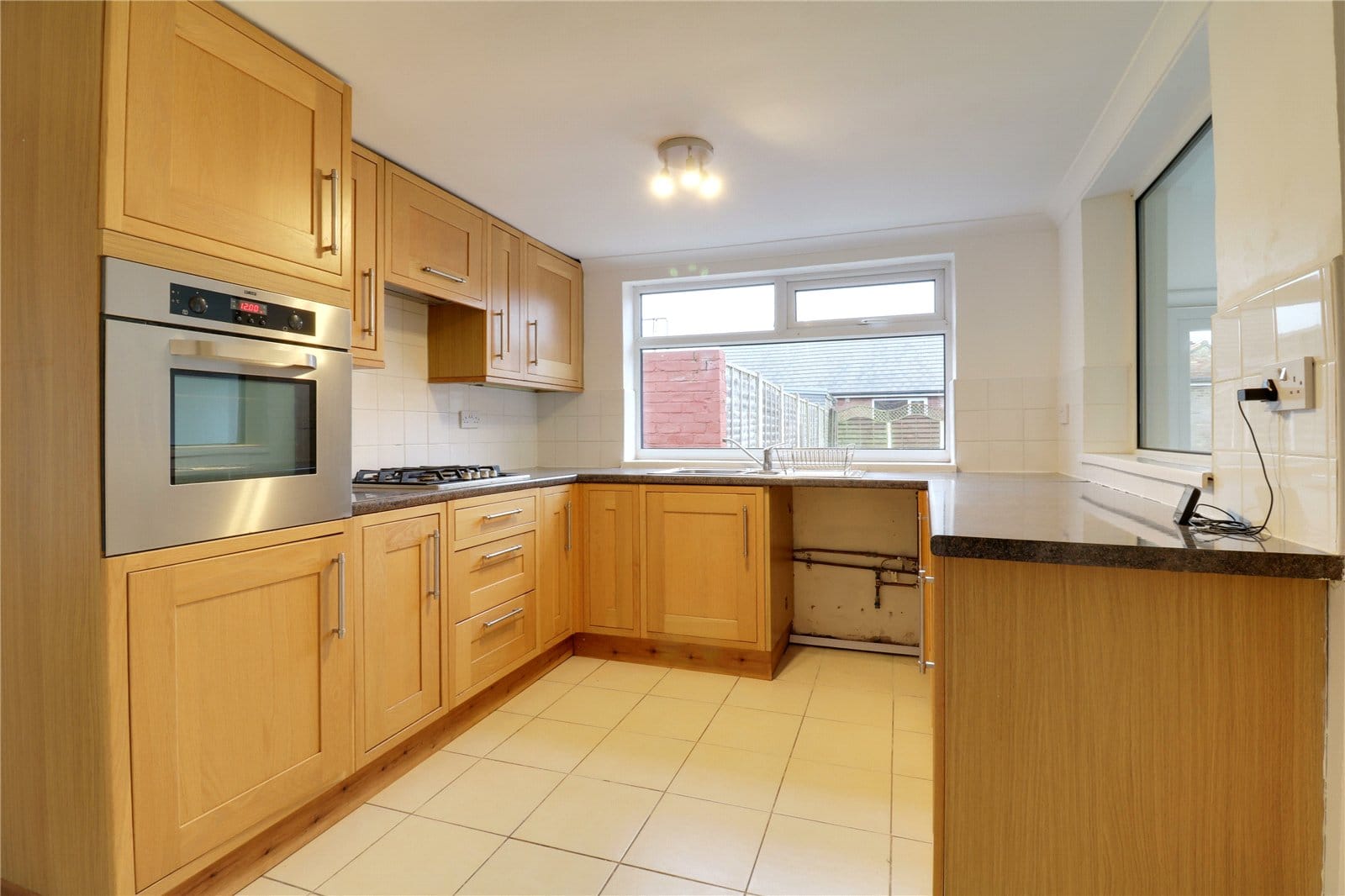 With a rear uPVC double glazed window. The kitchen includes a range of oak shaker style low level units, drawer units and wall units with brushed aluminium style pull handles and a patterned working top surface incorporating a one an a half stainless steel sink unit with block mixer tap and drainer to the side, plumbing for a washing machine, space for an undercounter fridge, a four ring gas hob with overhead integrated extractor fan with an adjoining Zanussi electric oven, tiled flooring, ceiling spotlights and doors leading off to;