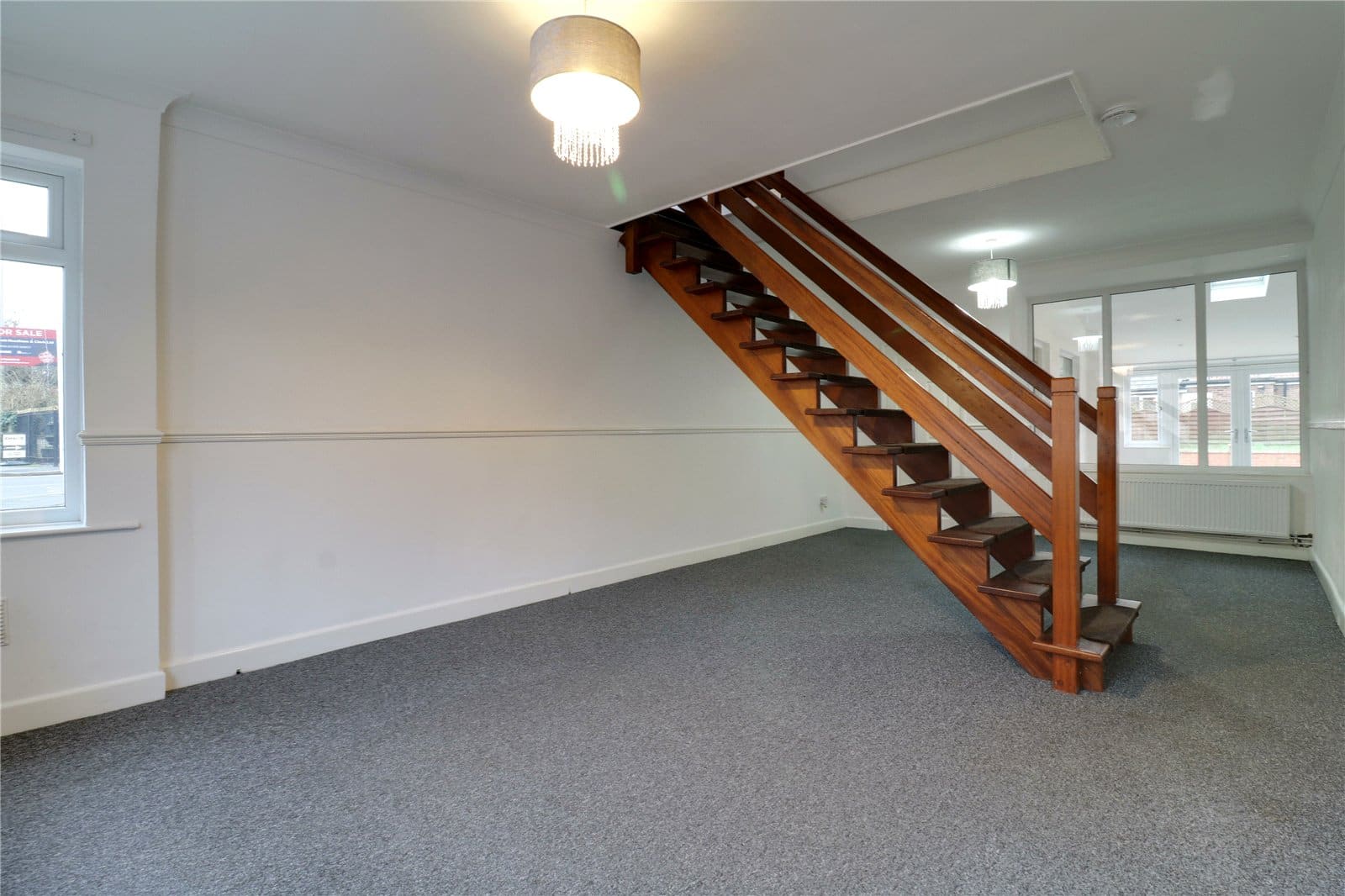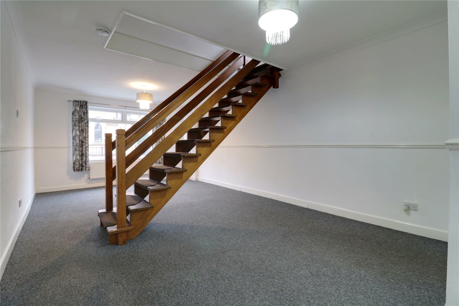 Enjoying a dual aspect with front, side and rear uPVC double glazed windows, wall to ceiling coving, dado railing and central open staircase leads to the first floor accommodation with adjoining grabrails.