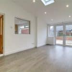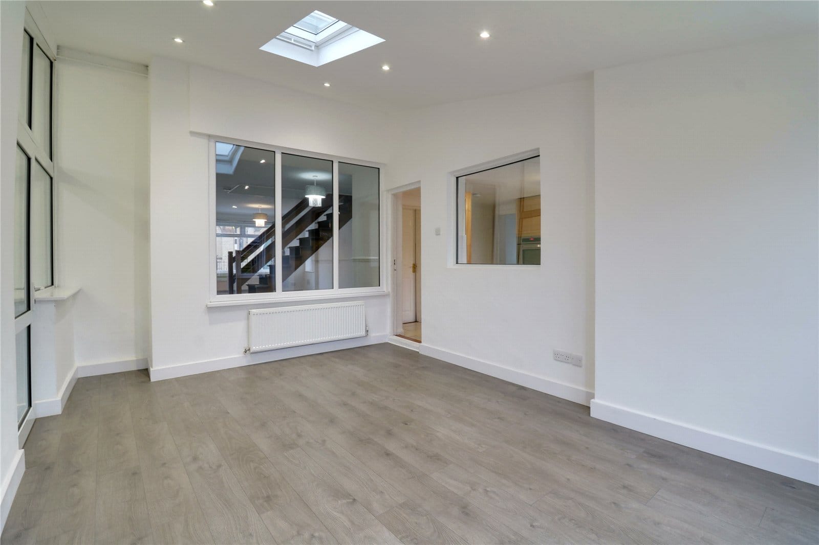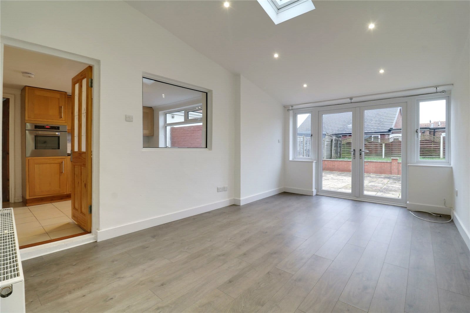 Enjoys twin French doors allowing access to the patio with adjoining windows, continuation of laminate flooring, Velux skylight, modern inset ceiling spotlights and a hardwood pine glazed door allows access through to the kitchen.
