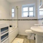 Rear uPVC double glazed window with inset patterned glazing, modern suite in white comprising a low flush WC, pedestal wash hand basin, panelled bath with electric shower over and glazed screen, laminate style flooring, tiled walls with central mosaic boarder and built-in airing cupboard.