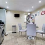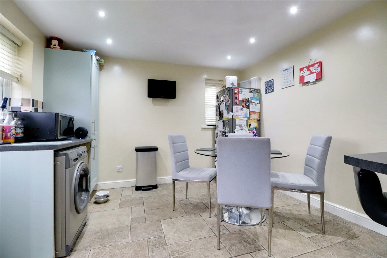 With side uPVC double glazed window, matching rear window with adjoining stable style entrance door leading to the garden, matching storage cabinets to the kitchen and space for appliances, continuation of tiled flooring and inset ceiling spotlights.