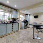 Rear uPVC double glazed windows. The kitchen enjoys an extensive range of shaker style furniture with brushed aluminium style pull handles with a complementary patterned worktop with tiled splash backs incorporating a one and a half bowl stainless steel sink unit with drainer to the side and block mixer tap, space for a cooker with overhead canopied extractor and plumbing for a dishwasher, central breakfast bar, tiled flooring, inset ceiling spotlights and broad opening leads through to;