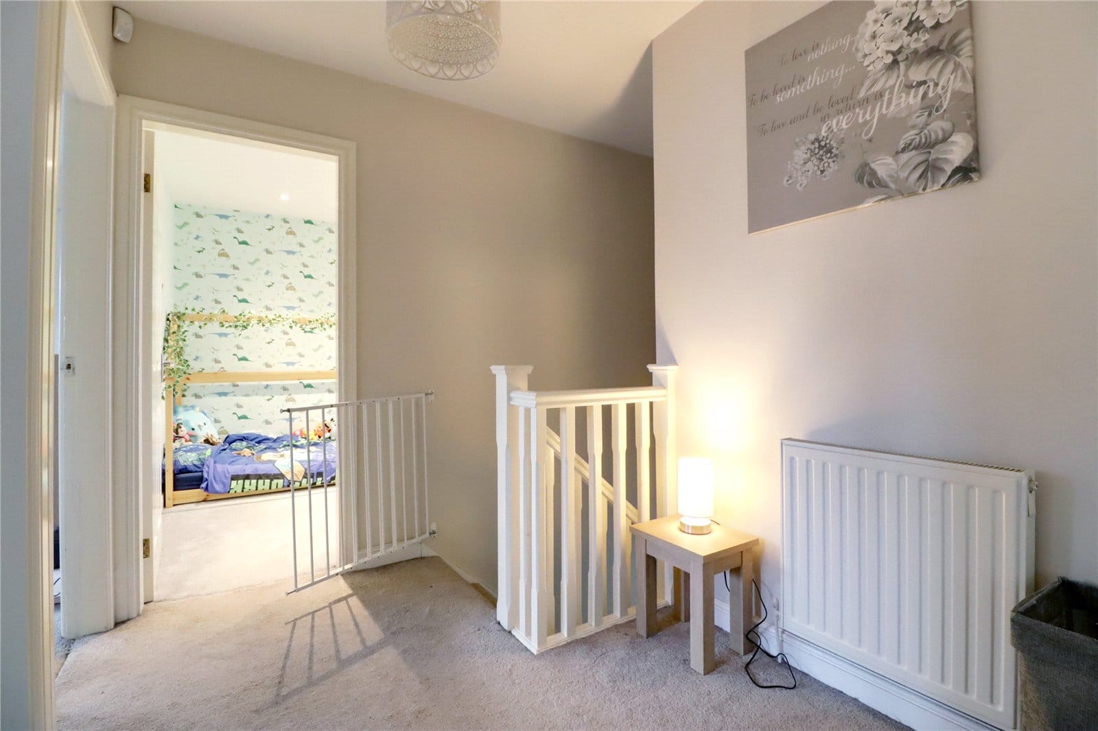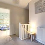 Continuation of open spell balustrading, loft access and doors through to;