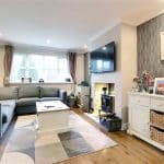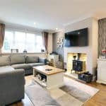 With a broad front uPVC double glazed window, handsome inset multi fuel cast iron stove within a tiled chamber with a raised projecting tiled hearth, laminate flooring, wall to ceiling coving, inset LED spotlights and internal French doors leads through to;