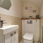 Enjoys a modern suite in white comprising a close couple low flush WC, vanity wash hand basin, tiled flooring and part tiling to walls with chrome towel rail.