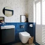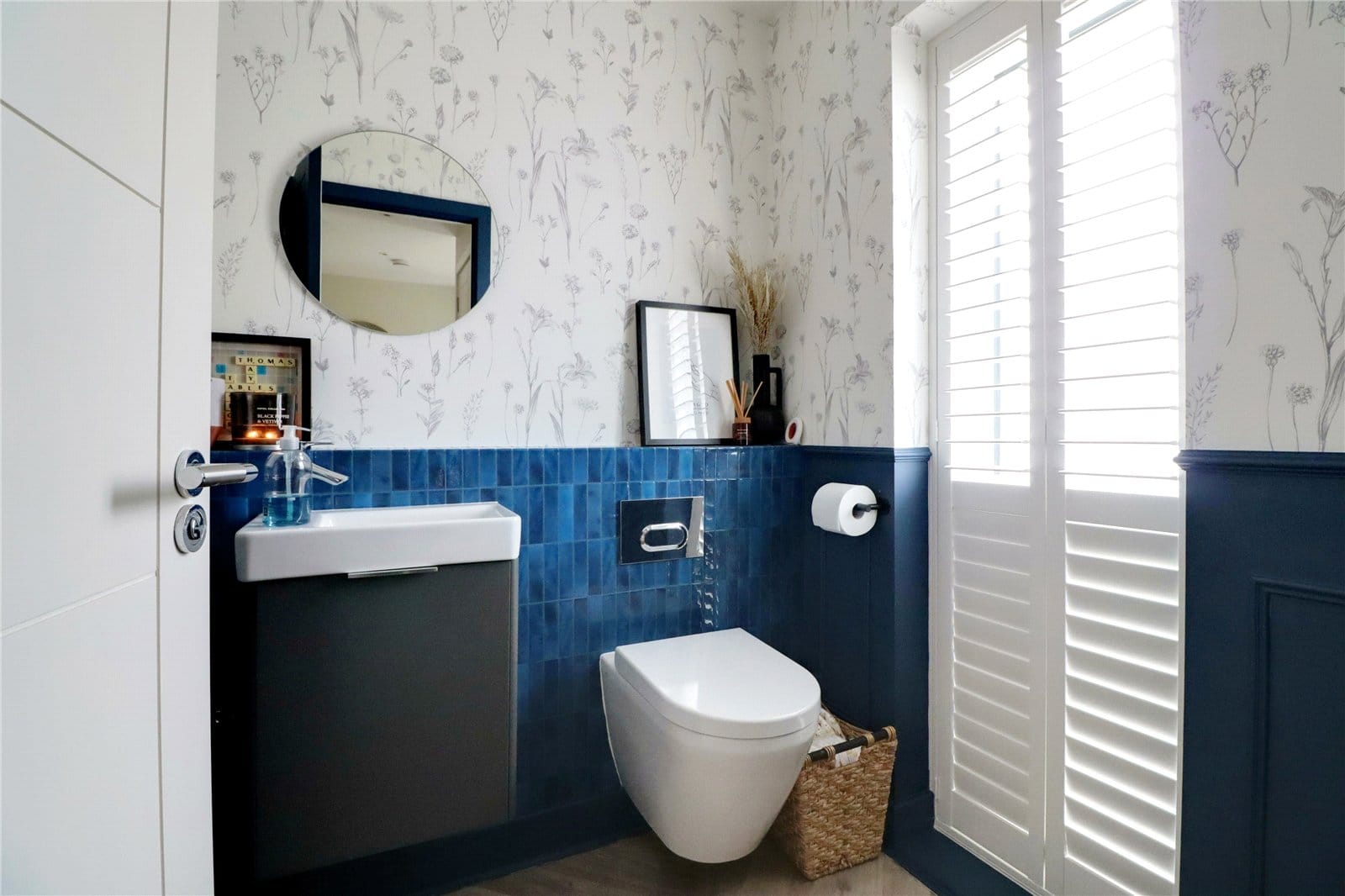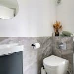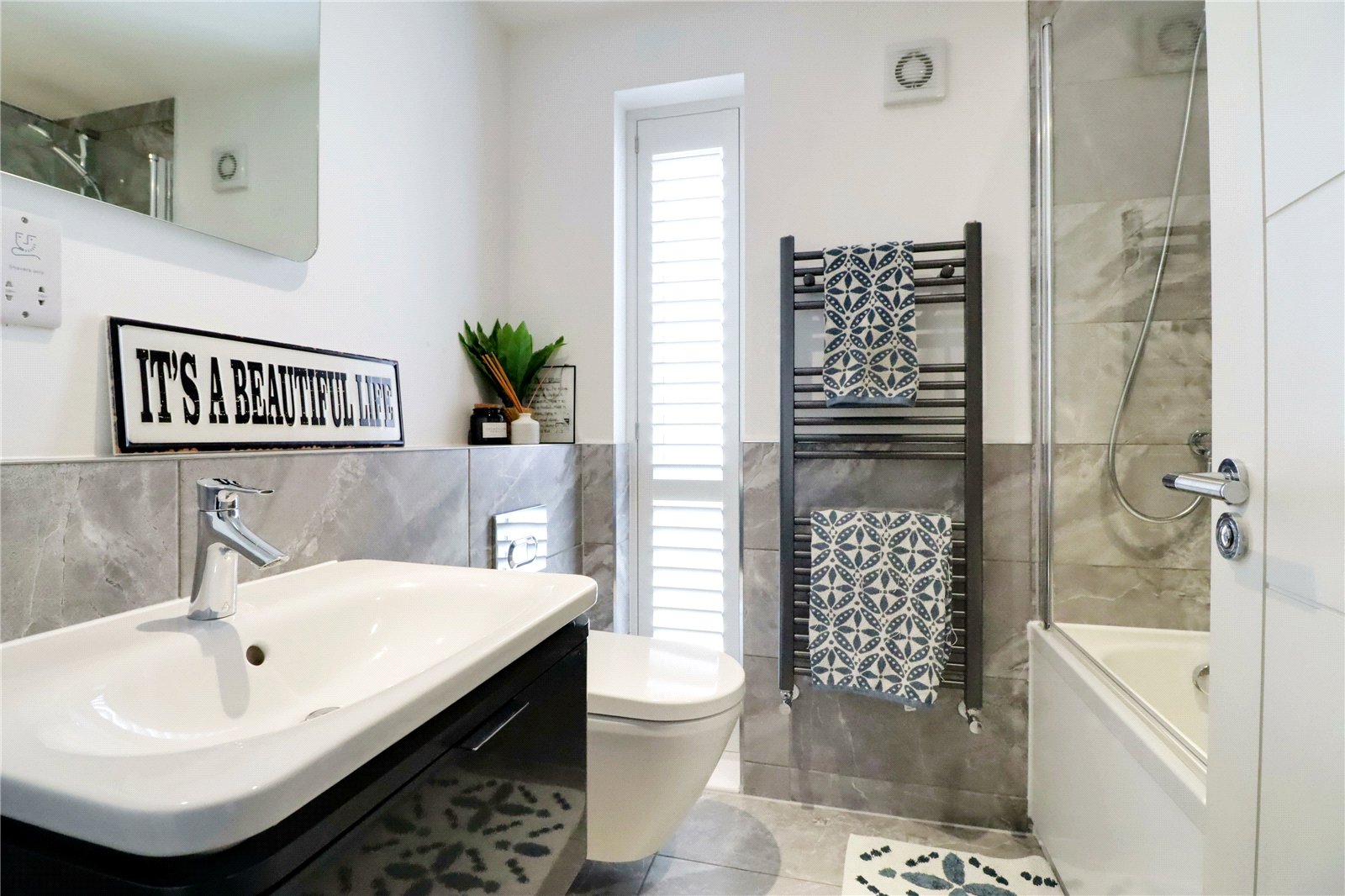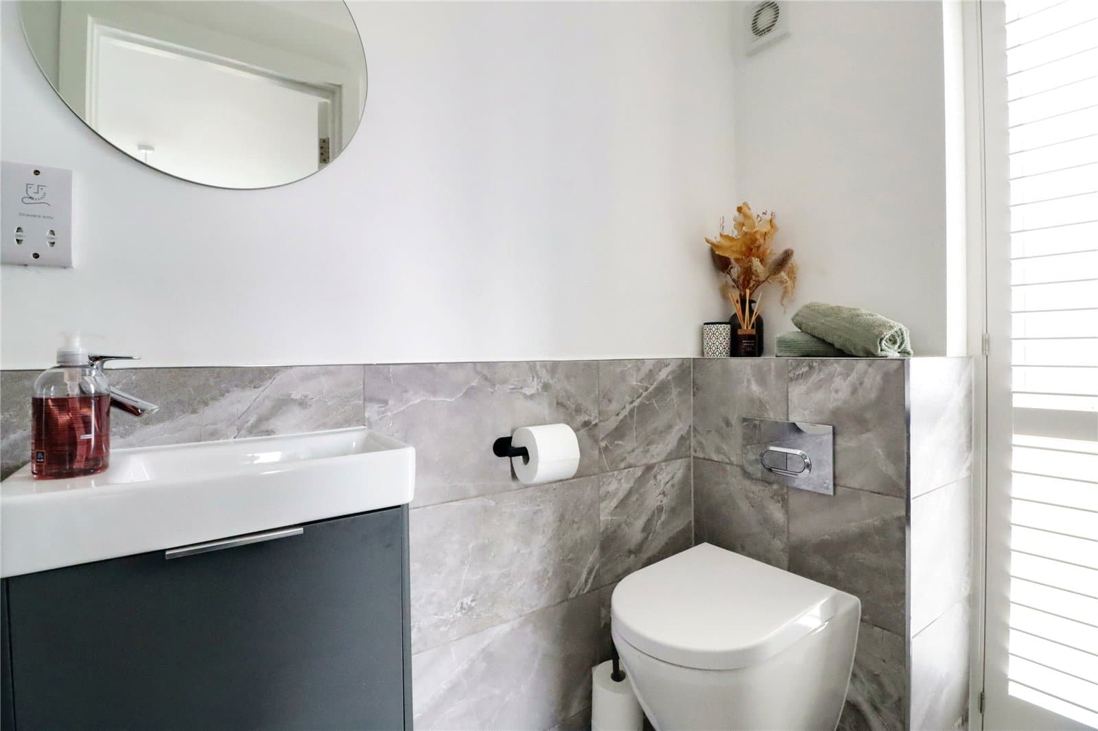 Front uPVC double glazed window with frosted glazing with fitted shutters providing a two piece modern suite including a close couple low flush WC, wall mounted vanity wash hand basin, part panelling to walls, fitted towel rail and inset LED spotlights.