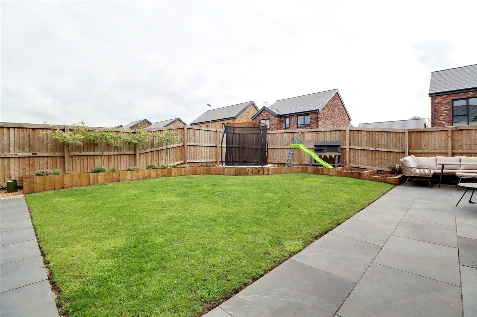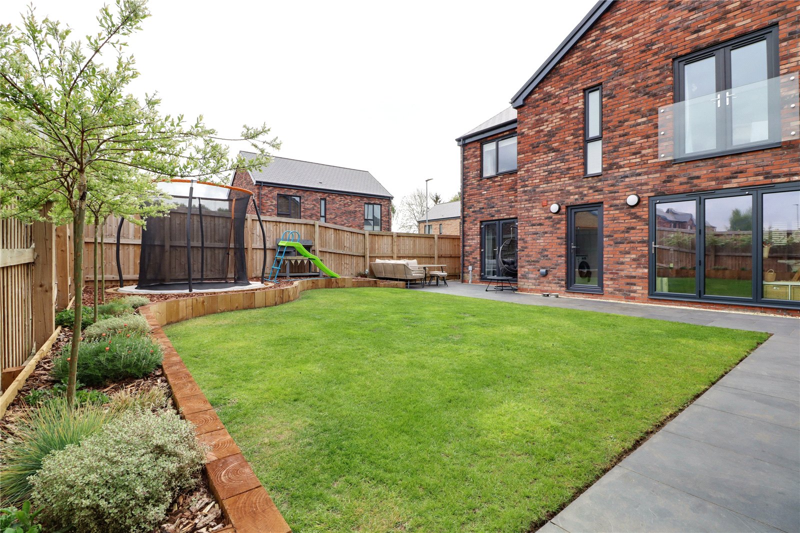 To the front the property enjoys a manageable lawned garden which continues to the side with slate steps leading to a front entrance door with matching perimeter pathway. Gated access leads to the rear garden being fully enclosed and has been recently landscaped providing a flagged seating area, central lawn and sleeper raised borders. To the west side there is a block paved driveway which provides parking for a number of vehicles while allowing access to the garage and having an electric charging pod.
