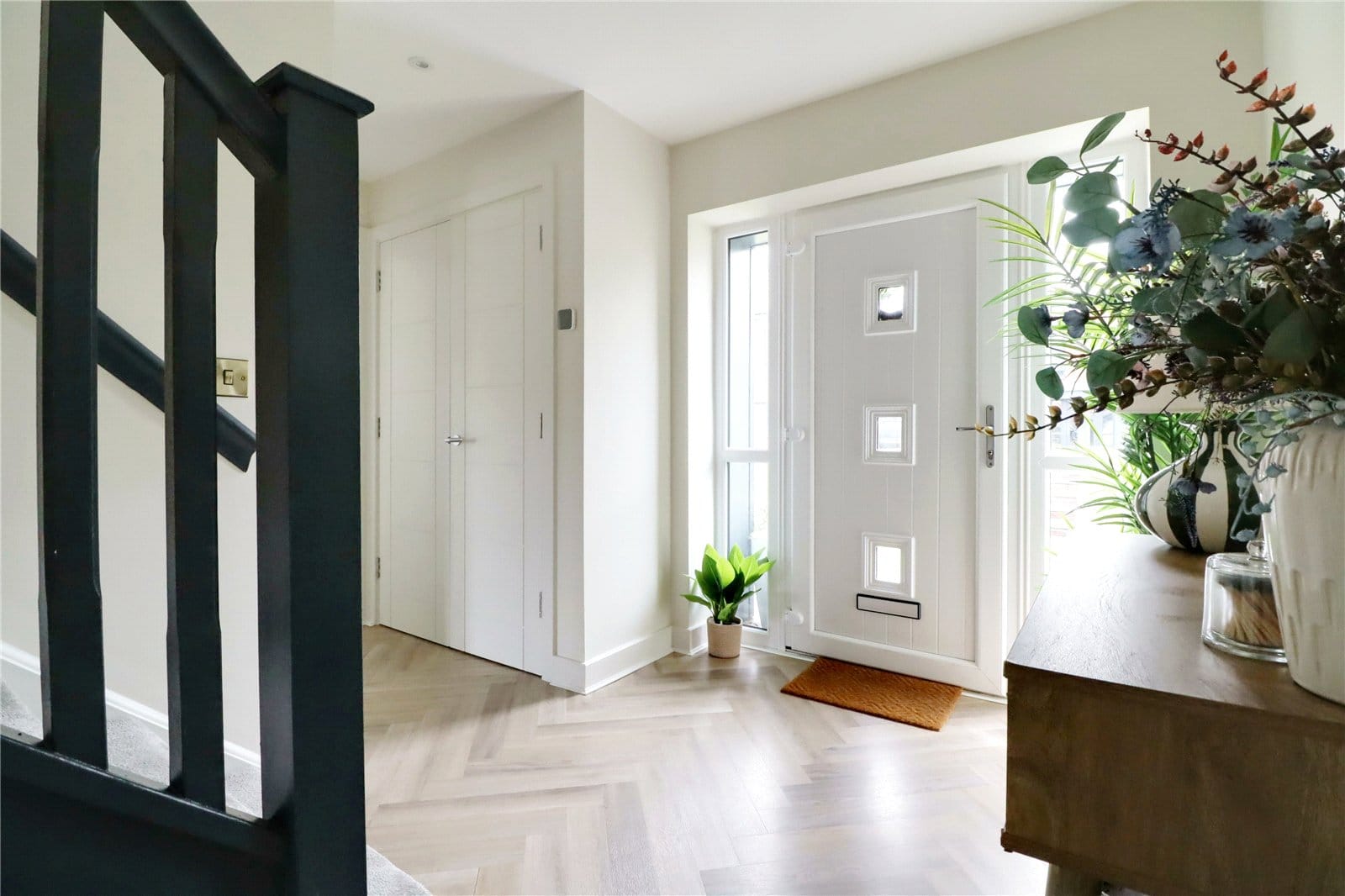 Front uPVC double glazed entrance door with adjoining side light, attractive luxury herringbone vinyl style flooring, straight flight staircase leads to the first floor accommodation with grabrail and part balustrading, inset ceiling spotlights, wall mounted thermostat for the central heating and a large built-in storage cupboard.