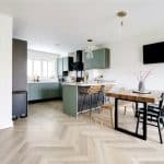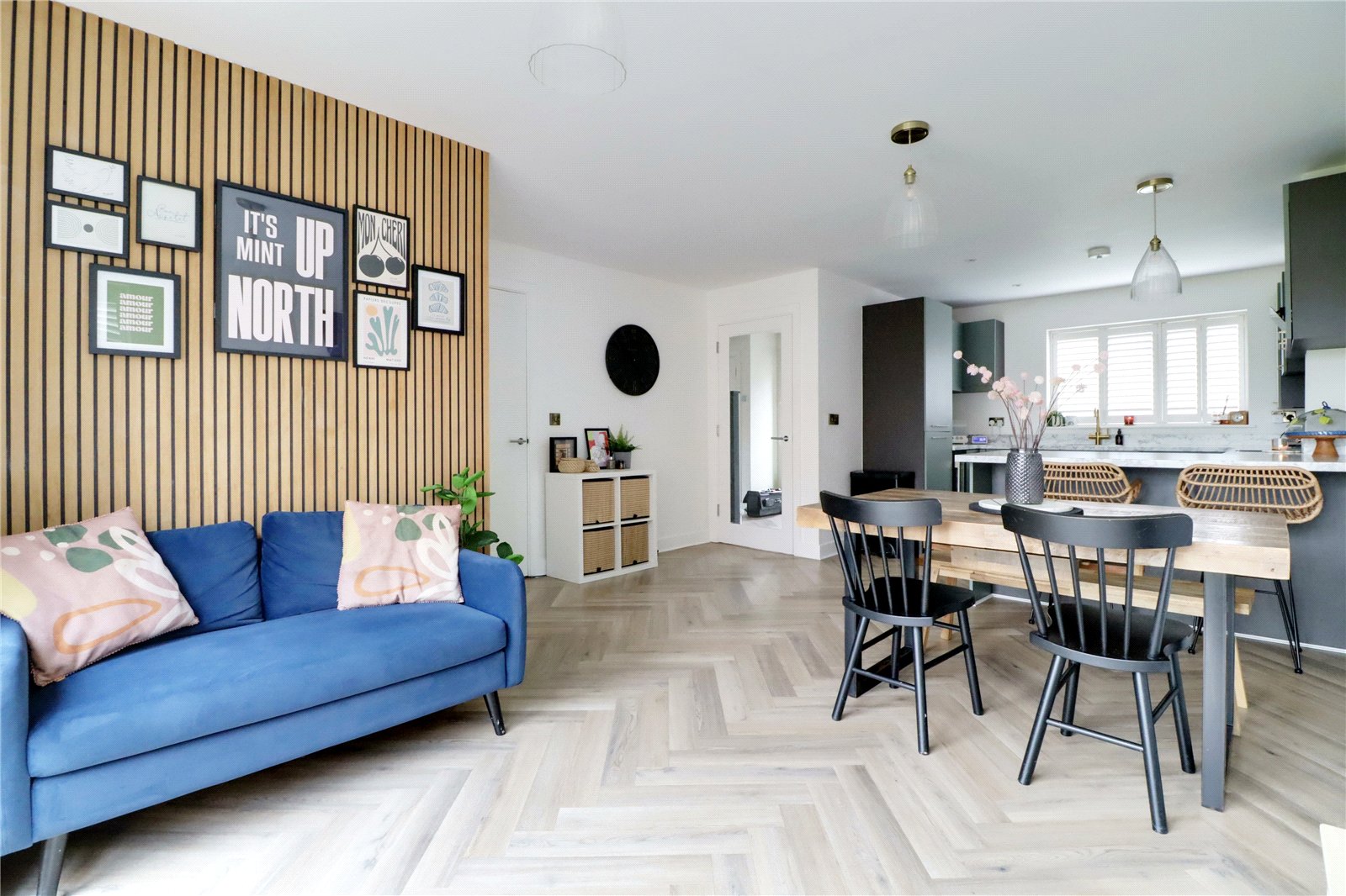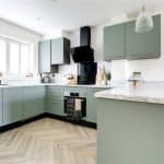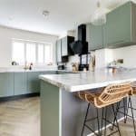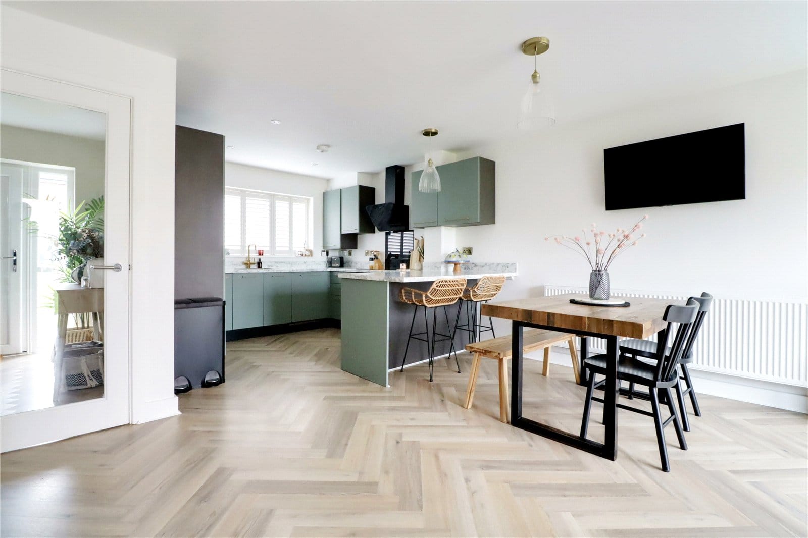 Enjoying a dual aspect with front and side uPVC double glazed windows with quality fitted shutters and a three paned bi-folding door allows access to the rear garden, continuation of herringbone flooring and a large under the stairs storage cupboard. The kitchen enjoys a quality range of contemporary furniture in a sage green with gold effect pull handles enjoying integral appliances and complemented by a marble effect worktop with matching uprising that incorporates a square stainless steel sink with block mixer tap, built-in four ring electric induction hob with glazed splash back and overhead extractor with oven beneath, eye level microwave, TV point and doors through to;