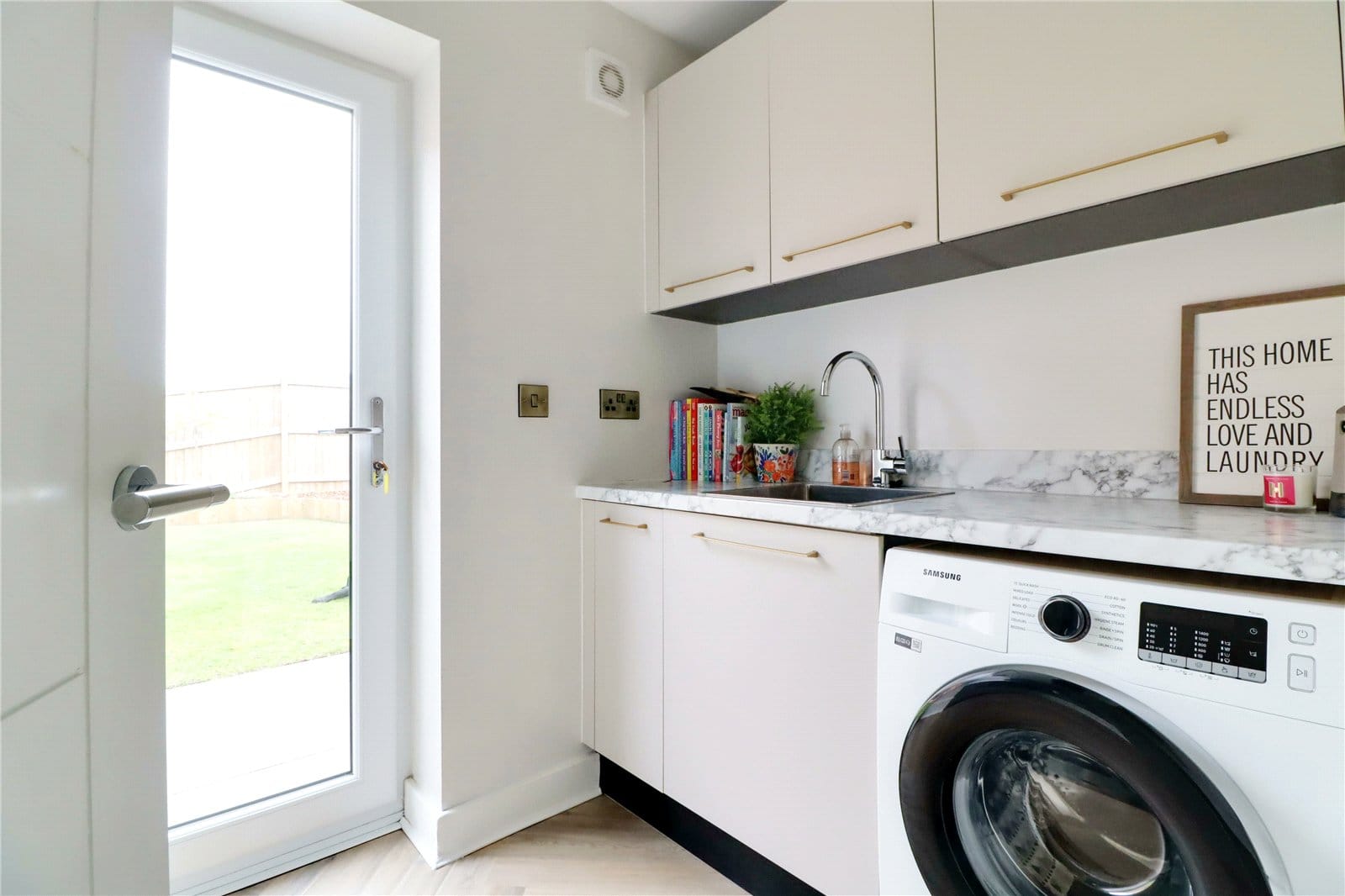 With rear uPVC double glazed entrance door allowing access to the garden, continuation of herringbone flooring, base and eye level storage cabinets with gold effect pull handles, marble style worktop with matching uprising incorporating a stainless steel sink with block mixer tap and drainer to the side and plumbing for an automatic washing machine.