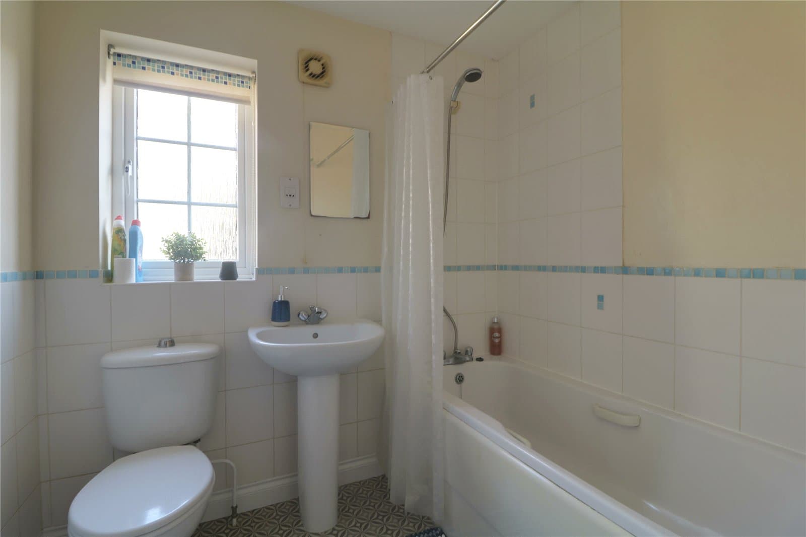 With a side uPVC double glazed window with frosted glazing, a three piece suite comprising a low flush WC, pedestal wash hand basin and a panelled bath with overhead shower with tiled splash back, vinyl flooring, part tiled walls and extractor fan.