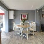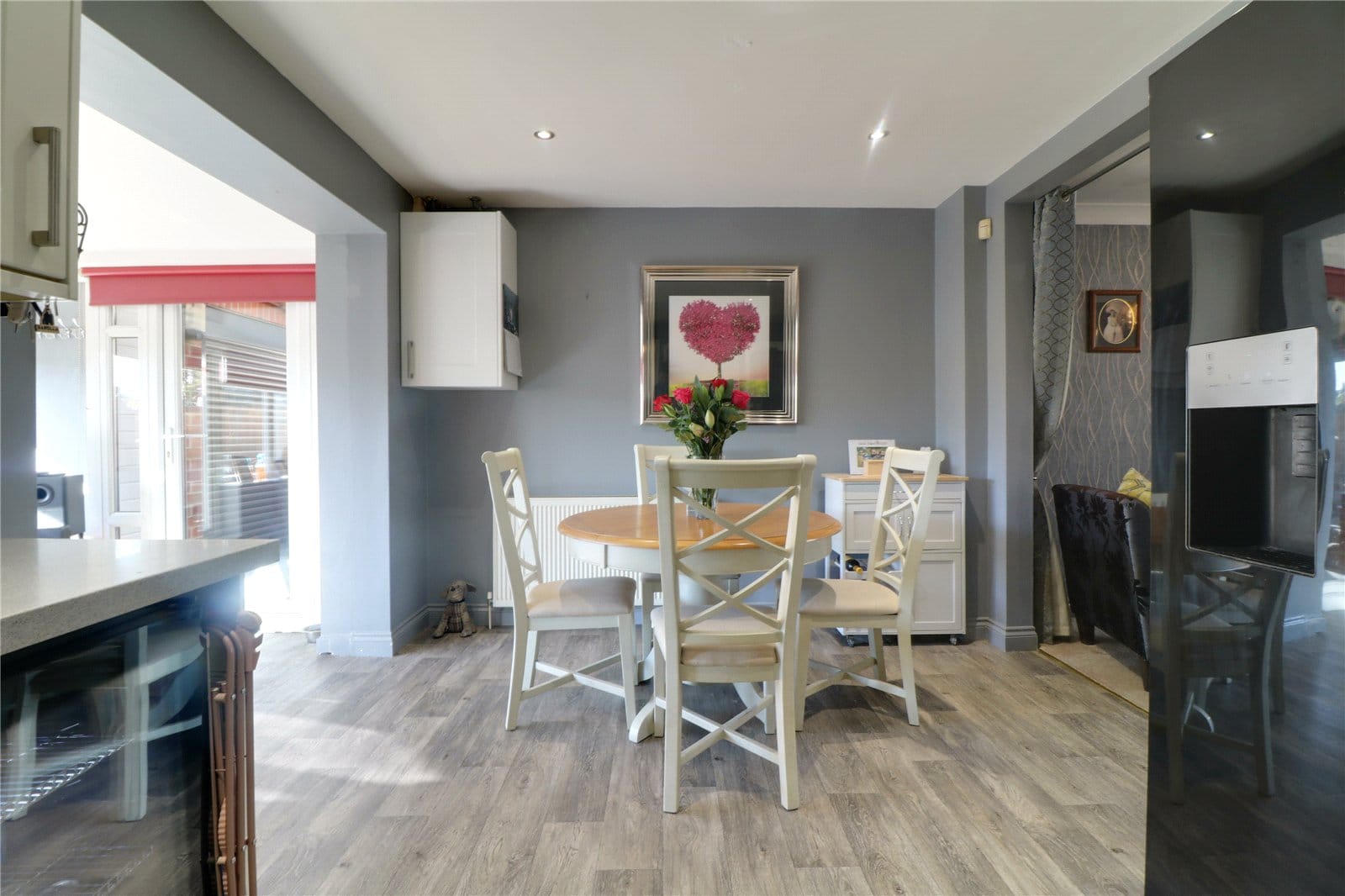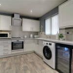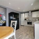 With a rear uPVC double glazed window. The kitchen includes a range of light shaker style low level units, drawer units and wall units with brushed aluminium style pull handles with a patterned working top surface incorporating a one and a half ceramic sink bowl unit with block mixer tap and drainer to the side, built-in Beko electric oven with four ring Belling gas hob with overhead canopied extractor fan, plumbing for a washing machine, space for a tall American style fridge freezer, space for an undercounter fridge, oak style vinyl flooring, inset ceiling spotlights, a wall mounted Ideal Classic gas boiler and an opening that leads through to;