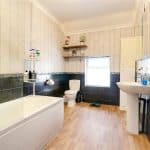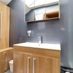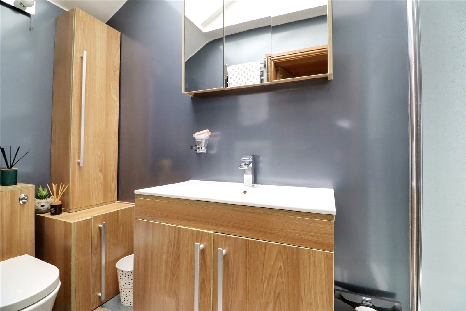Large Velux double glazed roof light, providing a stylish suite comprising a close couple low flush WC, matching broad vanity wash hand basin and large shower cubicle with glazed screen and mains shower, slate tiled flooring, fitted chrome towel rail and PVC clad to walls.