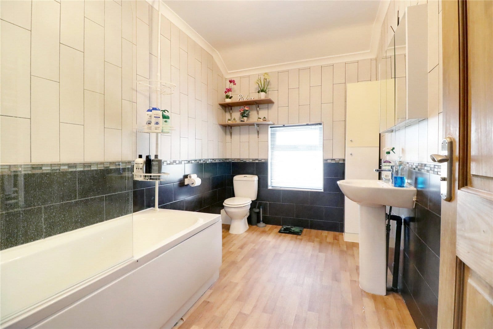 Side uPVC double glazed window providing a suite in white comprising a low flush WC, pedestal wash hand basin, panelled bath with electric shower over and glazed screen, cushioned flooring, tiling to walls and fitted towel rail.