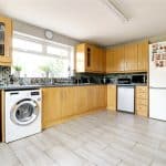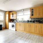 Benefits from a dual aspect with rear and side uPVC double glazed windows. The kitchen enjoys an extensive range of shaker style furniture with two wall units with glazed fronts, enjoying a complementary patterned top with tiled splash backs, incorporating a single sink unit with drainer to the side and block mixer tap, space for a Range cooker with broad overhead canopied extractor, plumbing and space for appliances, tiled flooring and internal uPVC double glazed door leads through to;