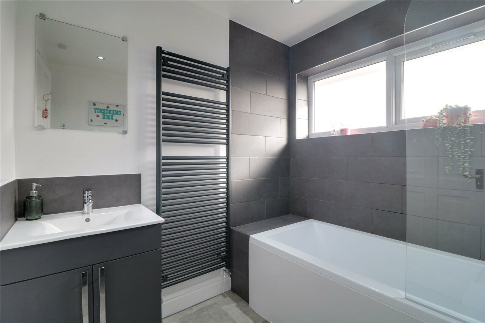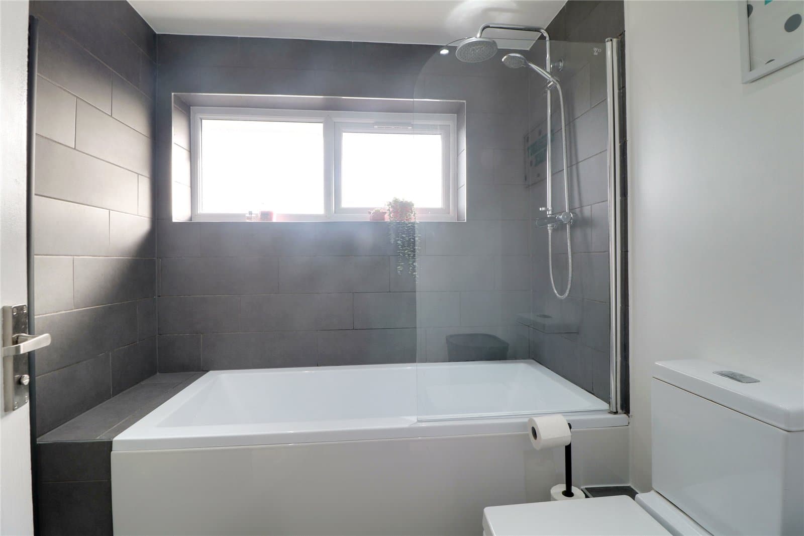 With a rear uPVC double glazed window with frosted glazing and a three piece suite comprising of a panelled bath with overhead chrome main shower, a low flush WC, a vanity wash hand basin with storage units beneath, tiled splash backs to the bath enclosure with glazed screen, a wall mounted towel heater in gun mental grey, cushioned flooring, inset ceiling spotlights and extractor fan.