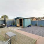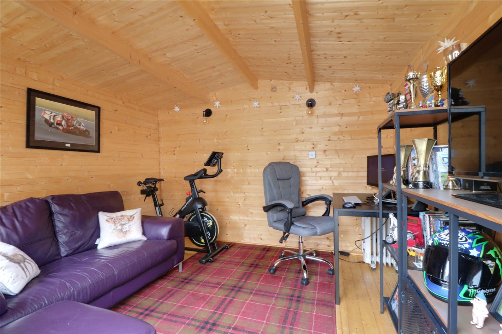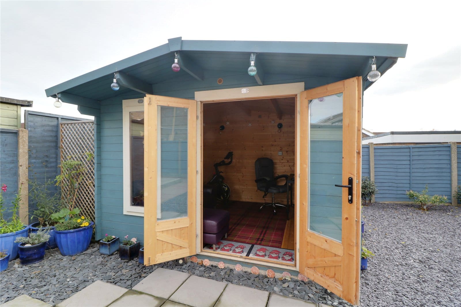 To the rear provides an extremely private landscaped low maintenance garden with raised decked seating area and an adjoining flagged patio area, decorative gravelling with raised sleeper planted borders, surrounding secure fencing and a substantial timber built outbuilding which could be utilised as a home office with internal power and lighting. To the front provides a block paved driveway allowing ample off street parking and access to the attached garage with an adjoining lawned garden with bricked boundary walling.