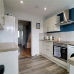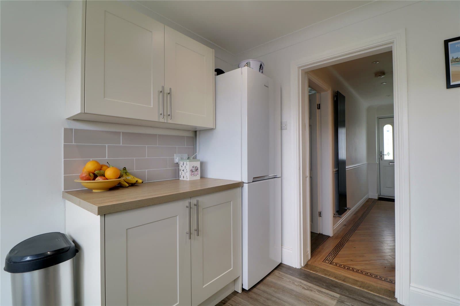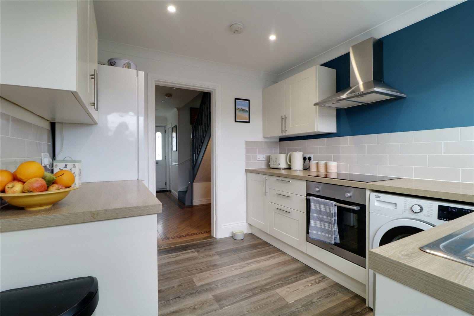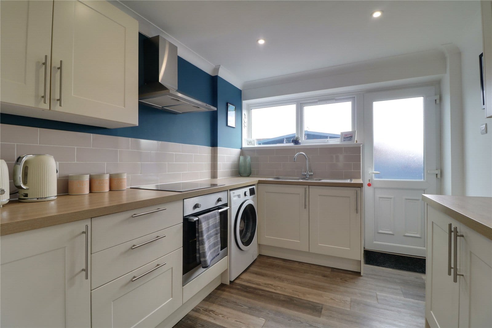 Rear uPVC double glazed entrance door with frosted glazing and adjoining window. The kitchen includes a range of light shaker style low level units, drawer units and wall units with brushed aluminium style pull handles and a laminate working top surface incorporating a one and a half stainless steel sink unit with drainer to the side and block mixer tap with ceramic tiled splash backs, built-in Zanussi induction four ring hob with matching oven below with plumbing for a washing machine, space for a tall fridge freezer, attractive oak style laminate flooring, modern inset ceiling spotlights and wall to ceiling coving.