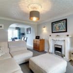 With a front bow uPVC double glazed window, wall to ceiling coving, an electric pebble effect fireplace with marble hearth and backing style with decorative surround and mantel, three single wall lights and an opening lead through to;