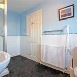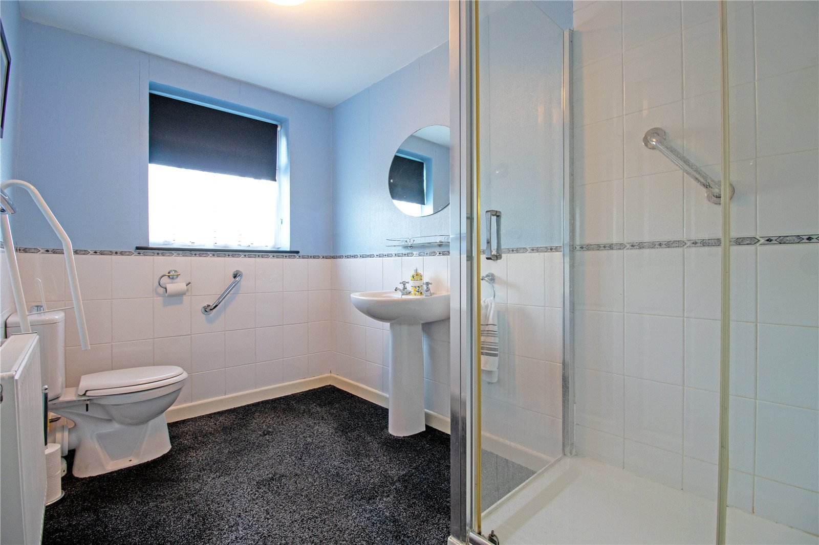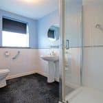 Has a side uPVC double glazed window with frosted glazing providing a three piece suite comprising a low flush WC, a double shower cubicle with sliding doors and overhead chrome main shower and pedestal wash hand basin and partly tiled walls.