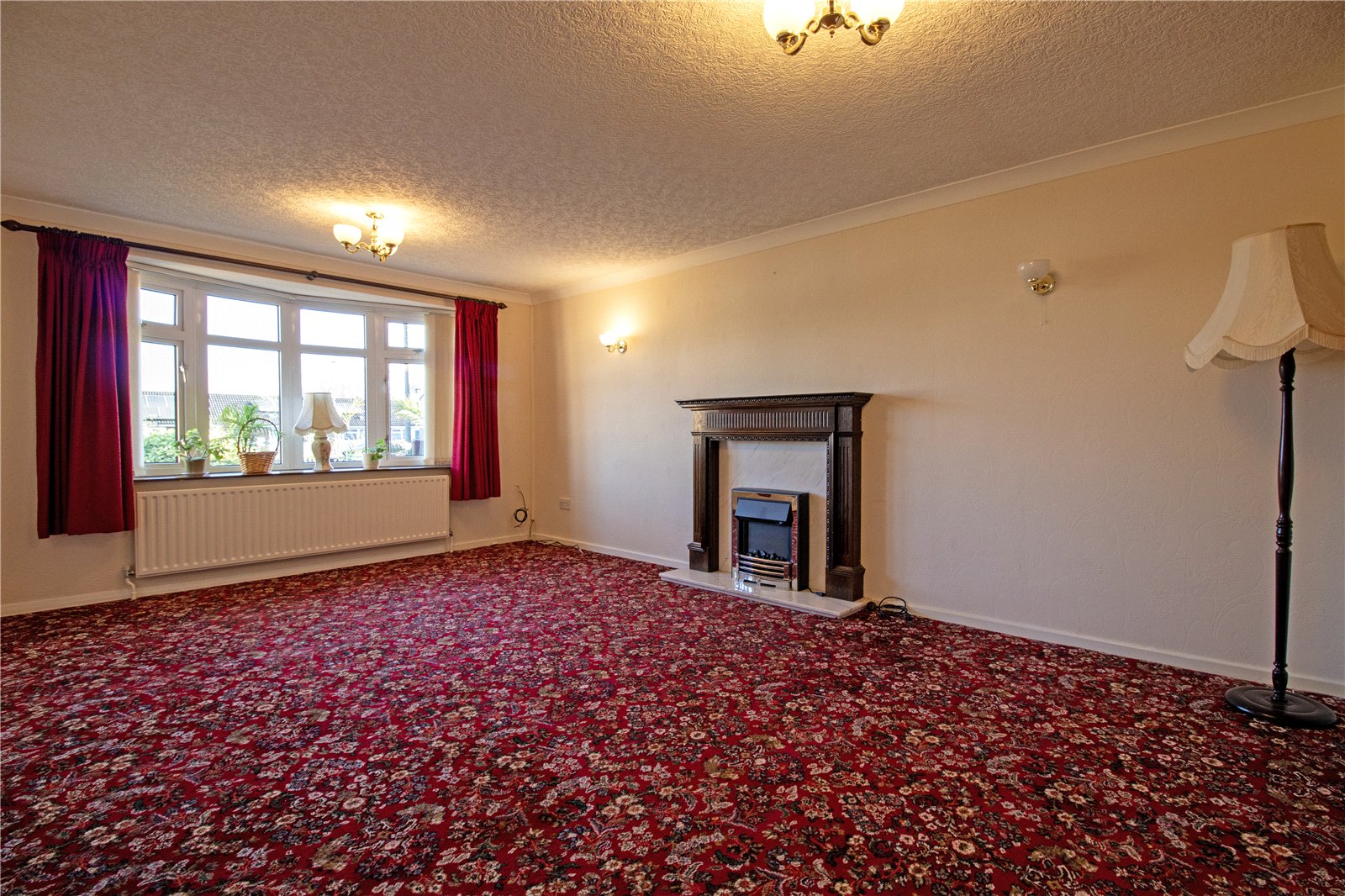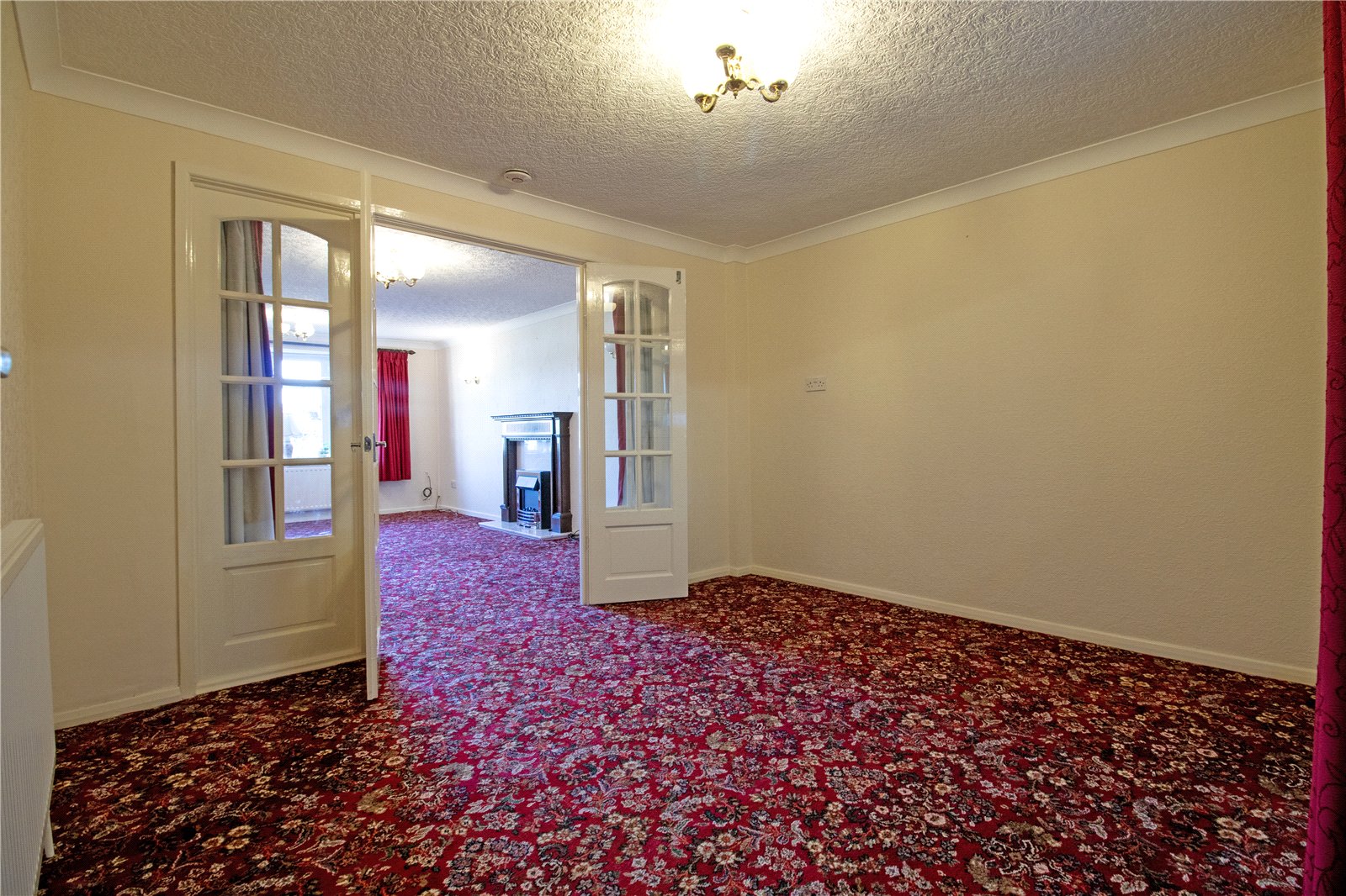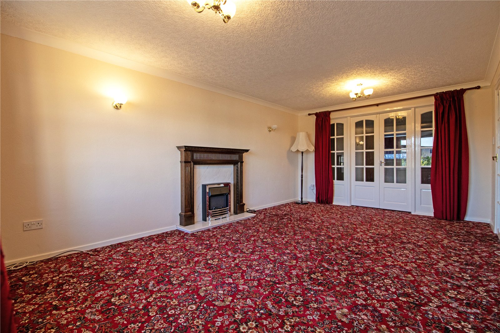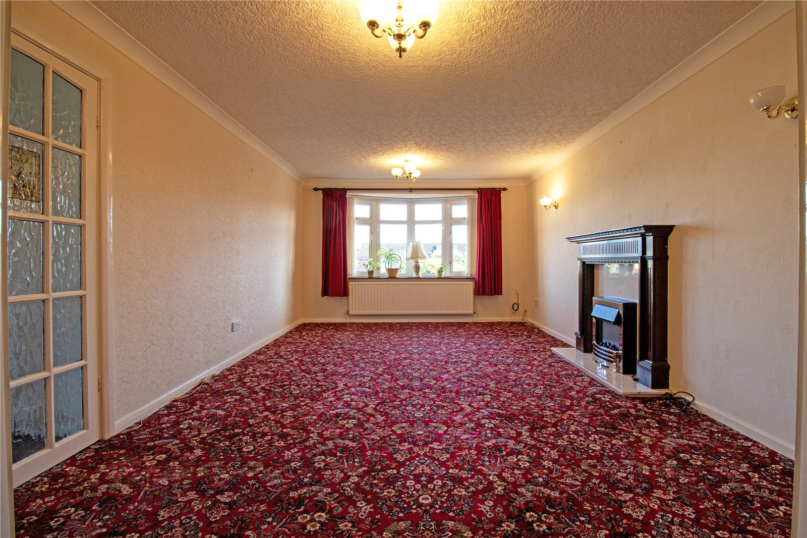 With a front bow uPVC double glazed window, two single wall lights and an electric fireplace marble style hearth backing, decorative surround and mantel, two twin internal glazed doors allows access off to;