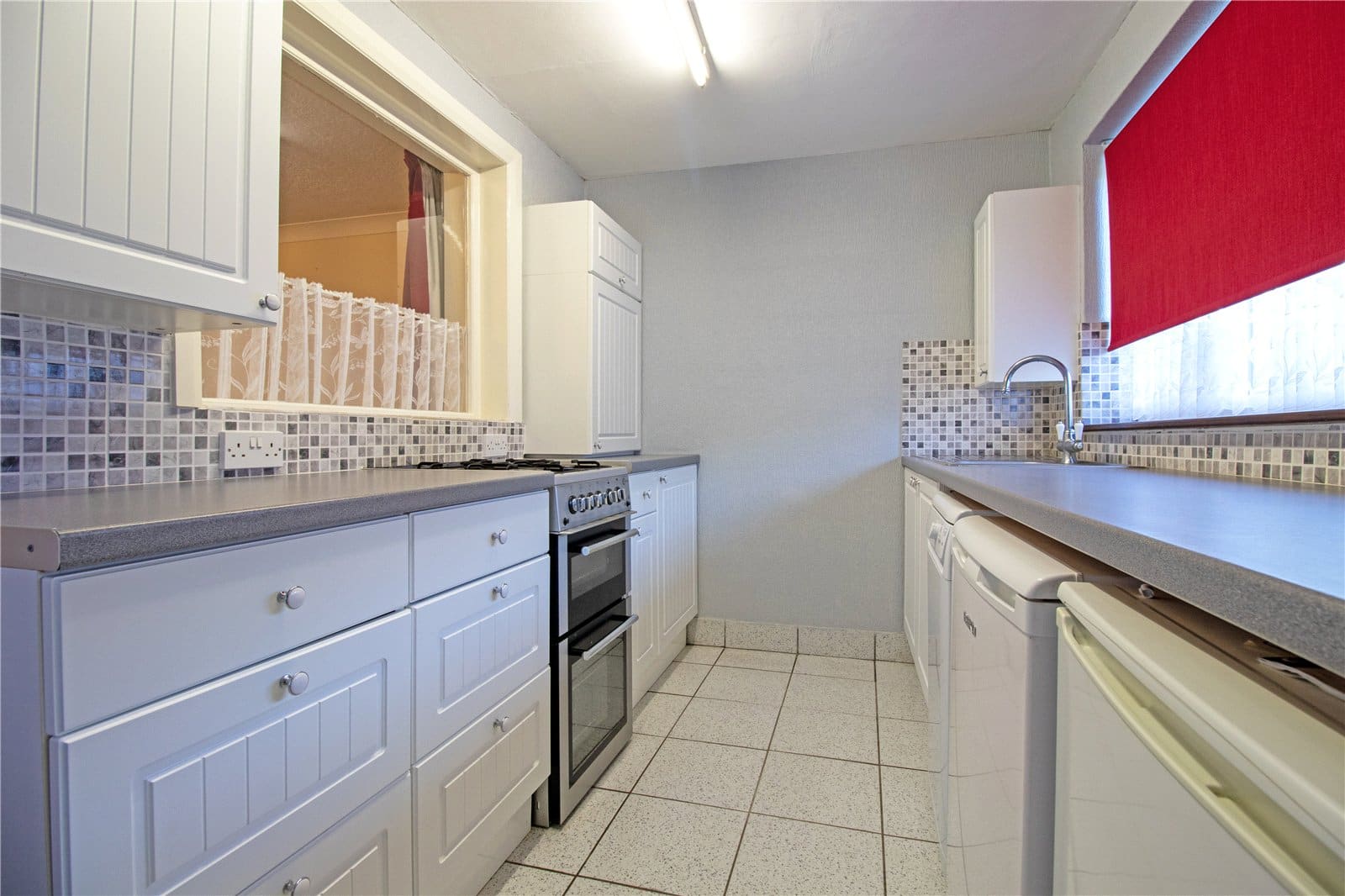 With a rear uPVC double glazed window and a side uPVC double glazed door allows access to the garden. The kitchen includes a range of white fronted low level units, drawer units and wall units with rounded pull handles and a patterned working top surface incorporating a one and a half stainless steel sink unit with block mixer tap and drainer to the side, space for a free standing cooker, plumbing for a dishwasher and space for an undercounter fridge.