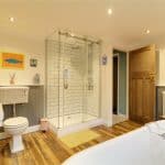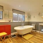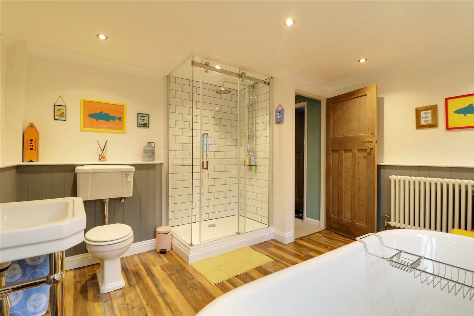 With two side uPVC double glazed windows with frosted glazing, a four piece suite comprising a double walk-in shower cubicle with overhead chrome mains shower, ceramic tiled splash backs, sliding glazed door and screen, raided tray, a low flush WC with a wall mounted wash hand basin, panelling to the walls, a free standing rolled top double ended bath and central shower attachment with chrome mixer tap, a period column double panelled radiator, attractive oak style cushioned flooring, ceiling spotlights, extractor fan and wall to ceiling coving.