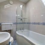 With a Velux skylight providing a three piece suite comprising a p-shaped panelled bath with overhead chrome mains shower with folding glazed screen, low flush WC and an oval wash hand basin with fully tiled walls, tiled flooring, wall mounted vertical towel heater in white and inset ceiling spotlights.