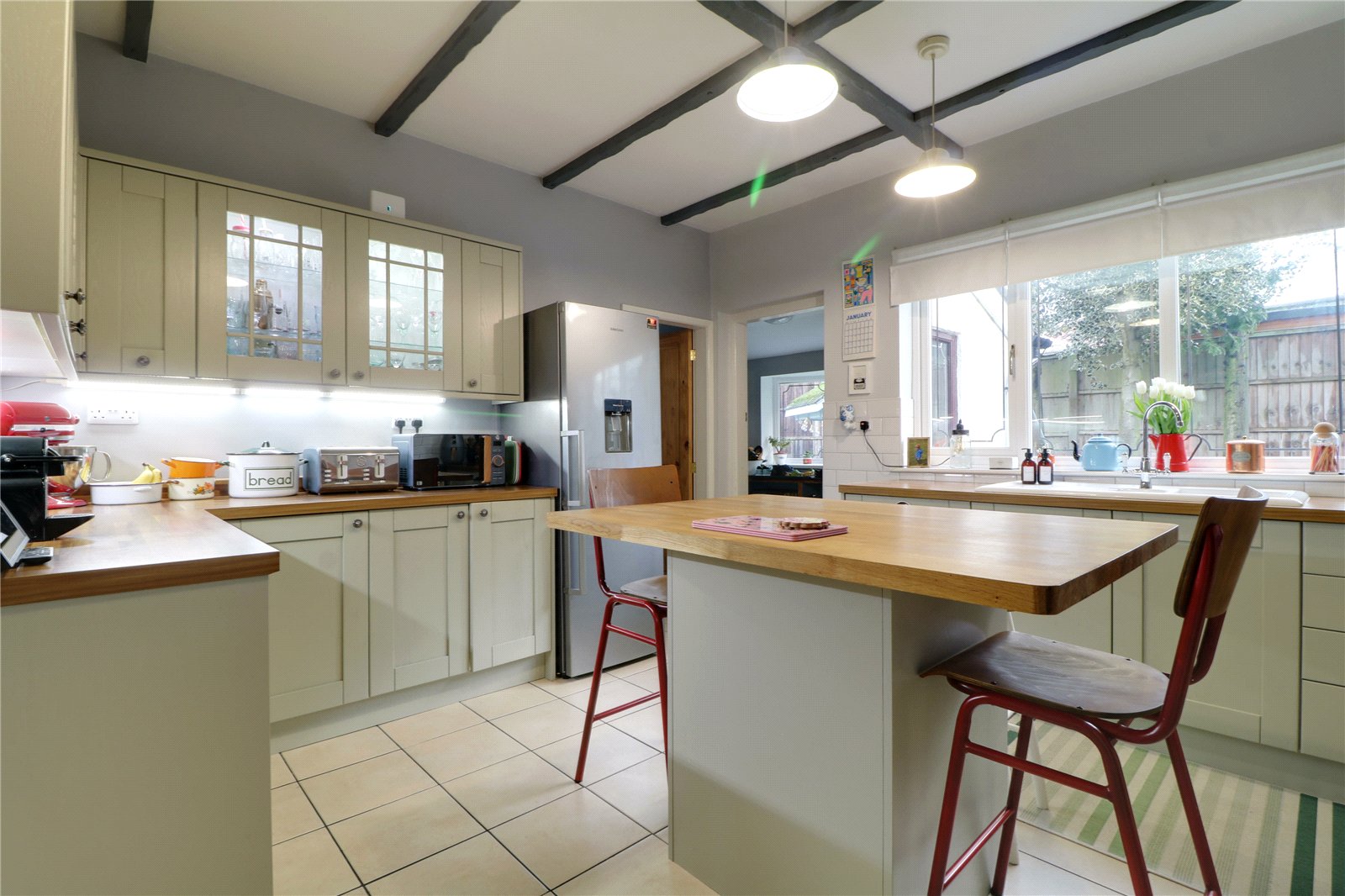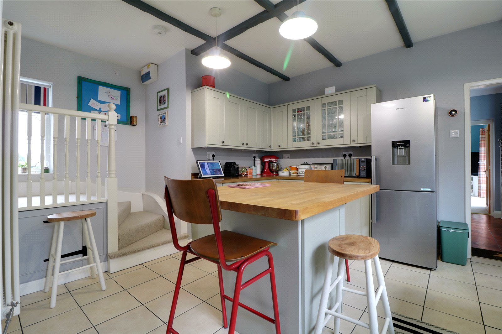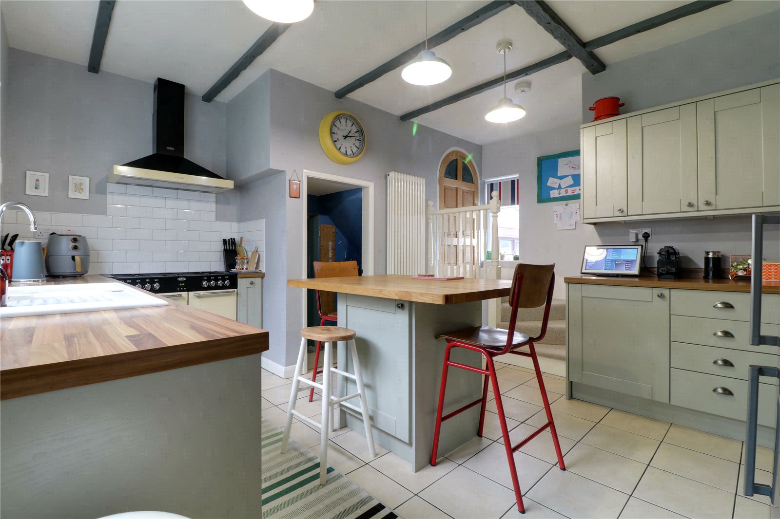 With a rear uPVC double glazed window and a door leads through to a rear boot room/entrance lobby. The kitchen includes a range of Olive light green shake style low level units, drawer units and wall units with glazed fronts with brushed aluminium style pull handles with a butcher block style working top surface that incorporates a one and a half porcelain sink bowl unit with drainer to the side and attractive ceramic tiled splash backs, space for a free standing Belling five ring gas hob with oven beneath and overhead matching extractor fan with downlighting and ceramic tiled splash backs, decorative beams to the ceiling, tiled flooring, space for an American style fridge freezer, plumbing for a washing machine, vertical wall mounted double modern panelled radiator, a dog legged staircase leads to the first floor accommodation with attractive arched glazed door and a front uPVC double glazed window.