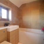 With a rear uPVC double glazed window with frosted glazing and a three piece suite comprising a panelled bath and overhead shower attachment, vanity wash hand basin with pine twin storage units beneath with adjoining low flush WC, tiled flooring, a wall mounted chrome towel heater and tiling to the walls with inset ceiling spotlights and extractor fan.