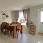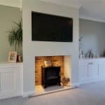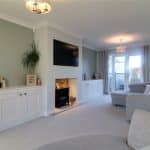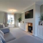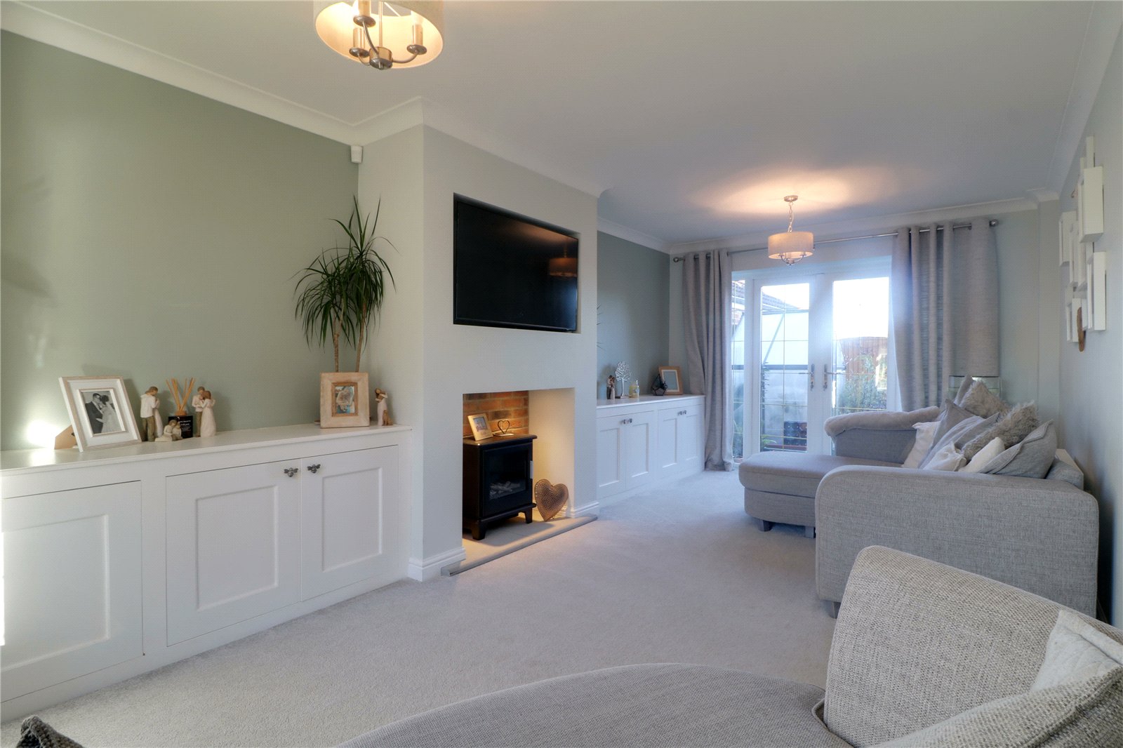 Including a dual aspect with front uPVC double glazed with rear French doors allowing access to the rear garden with adjoining side lights, wall to ceiling coving, TV input, built-in fitted storage cupboard and a feature central open fireplace with bricked backing, tiled hearth and inset LED spotlights with an imitation log effect fireplace.