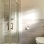 With a side uPVC double glazed window with frosted glazing providing a three piece suite in white comprising a walk-in shower cubicle with overhead chrome shower with twin curved glazed doors, a low flush WC and a vanity wash hand basin with storage units beneath, partly tiled walls, tiled flooring, a wall mounted chrome towel heater and extractor fan.