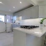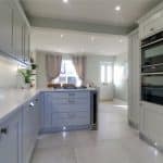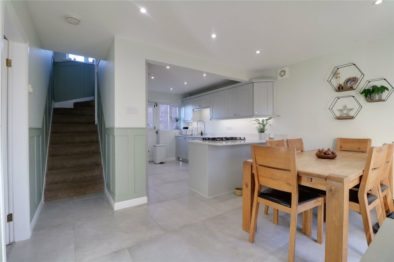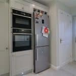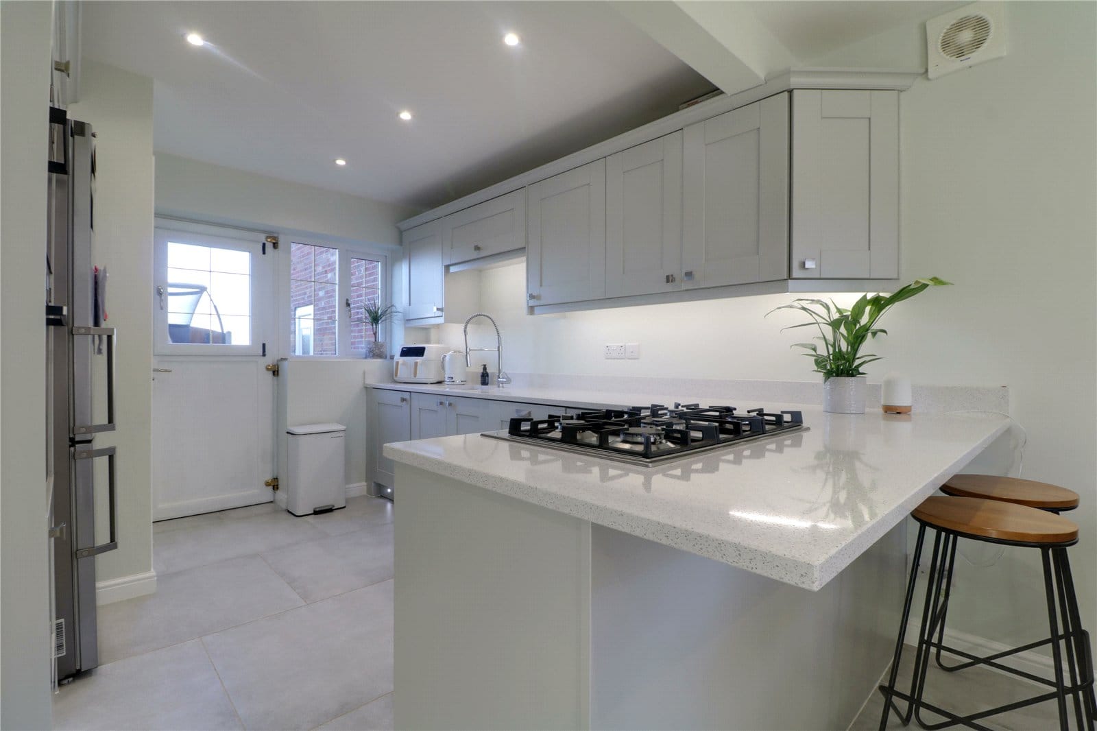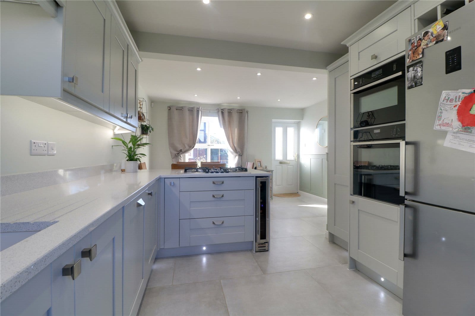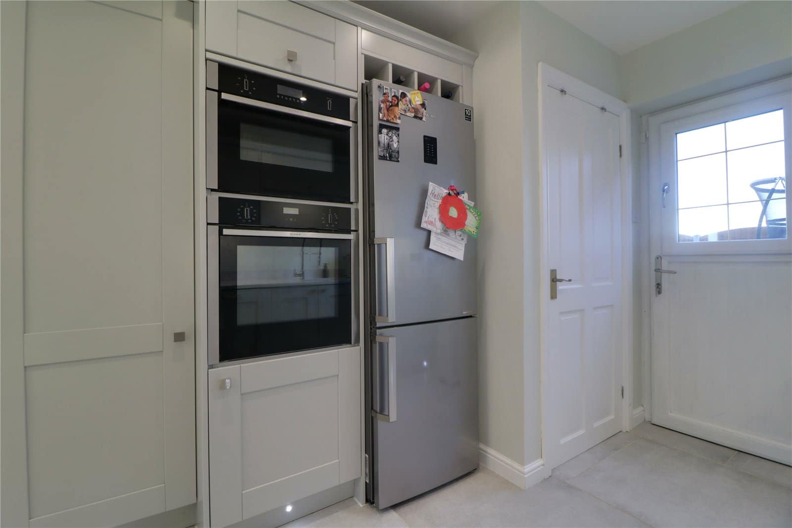 With stylish low level units, drawer units and wall units with squared brushed aluminium style pull handles and a quartz working top surfaces with matching uprising incorporating an inset Belfast sink unit with block mixer tap and drainer to the side, a range of integral Neff appliances including a five ring gas hob, a wine chiller, matching oven and double grill with inset space for a tall Samsung fridge freezer, inset ceiling spotlights, plumbing for an integral dishwasher, plumbing for an integral washing machine, tiled flooring, spacious storage cupboard houses an Ideal Logic gas combi boiler and a rear barn style double glazed door allowing access to the garden with adjoining window and extractor fan.