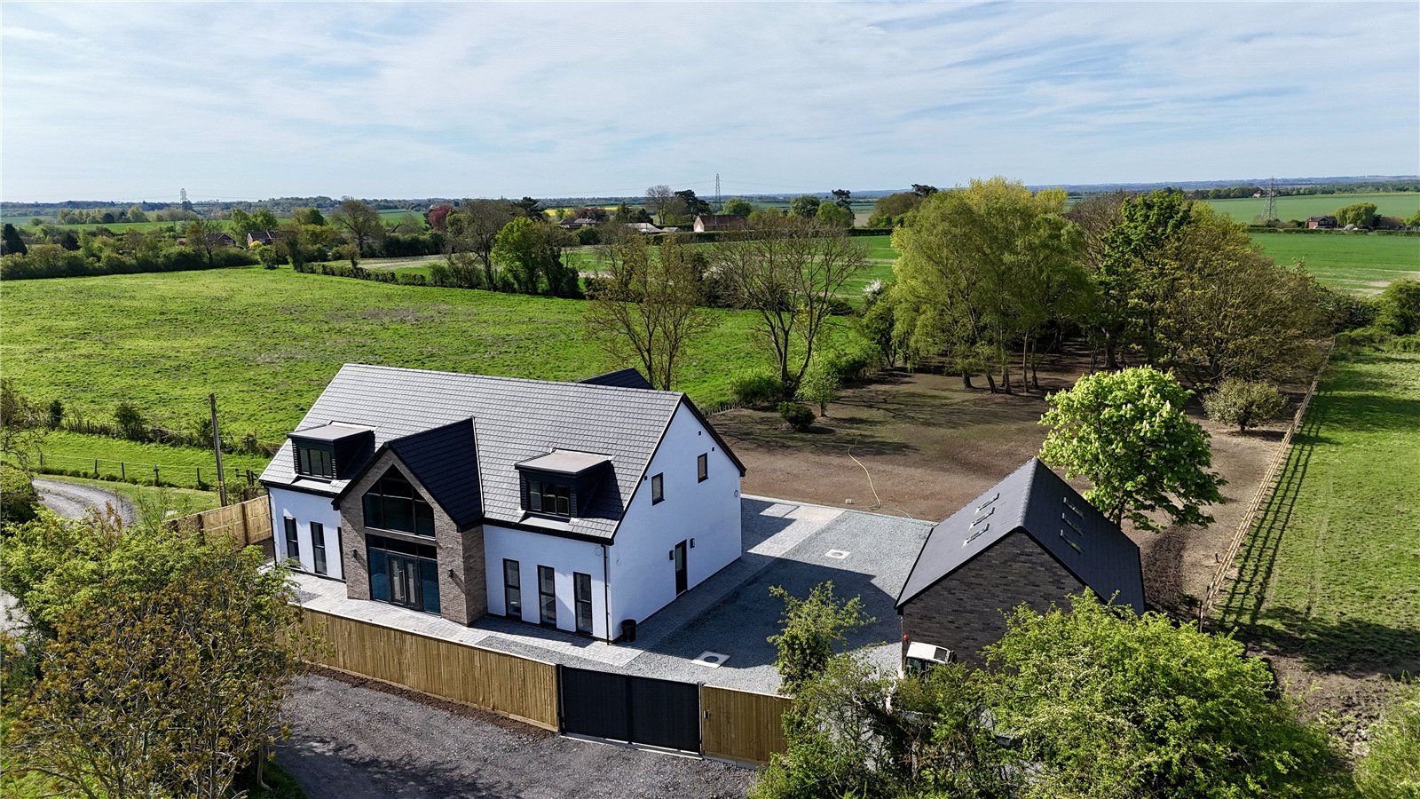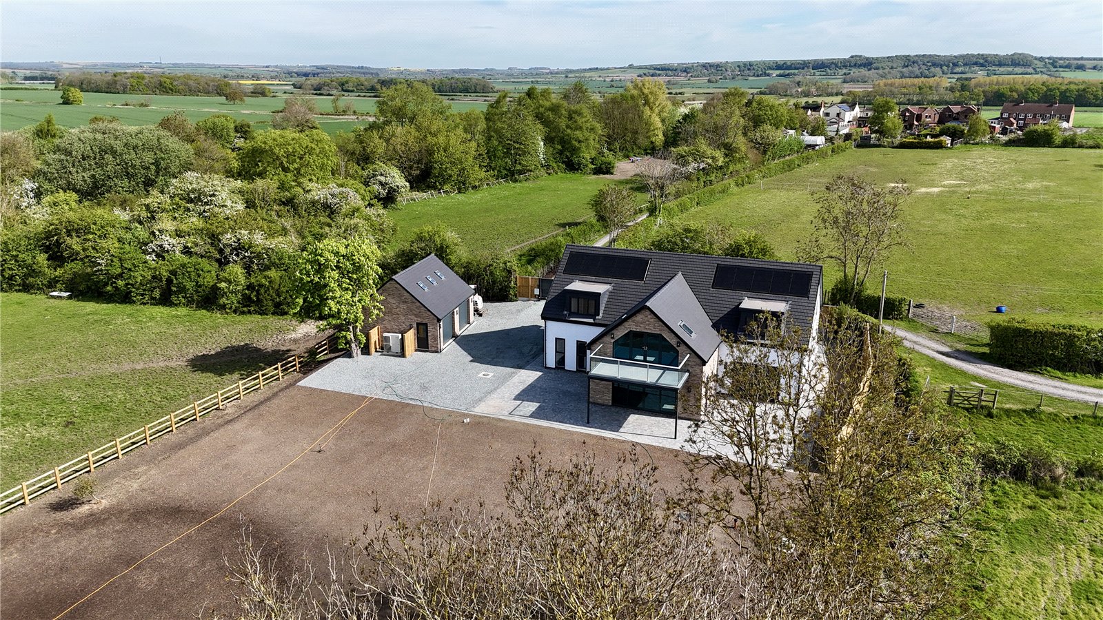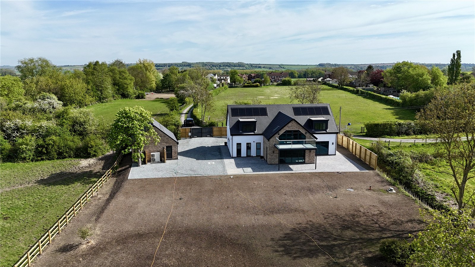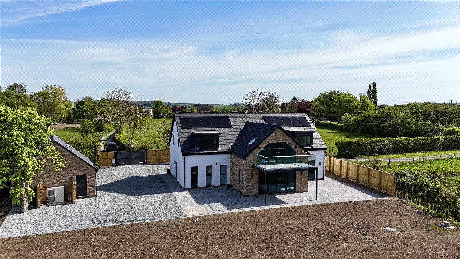 The property is positioned extremely discreetly down a private road with front fenced boundary providing screening and security with electric remote double opening gates with intercom onto a substantial front and side gravelled driveway providing parking for an excellent number of vehicles with storage for a caravan or motorhome if required, electric car charging point, outside water tap, perimeter pathways provides access to the front entrance door and continues to the rear providing seating areas. The garden is newly seeded and will be grass laid with open yet defined boundaries making the most of the adjoining countryside. With the garden also incorporating mature woodland area.