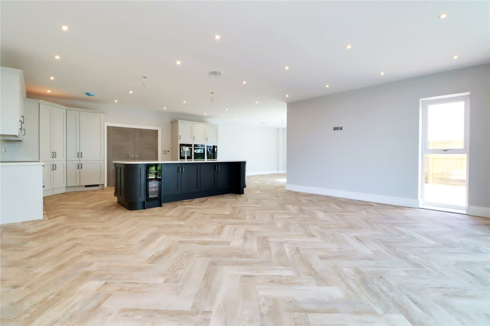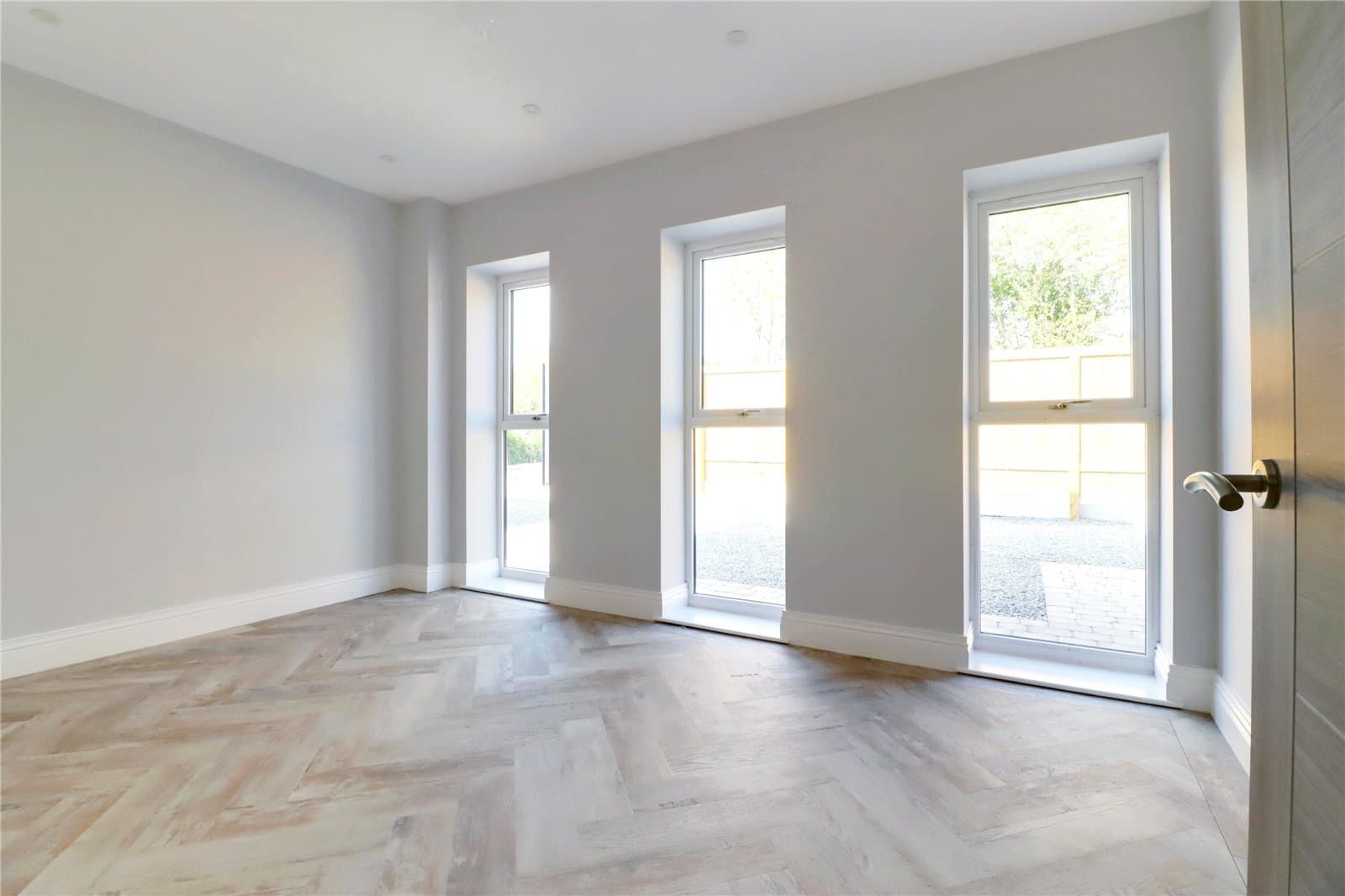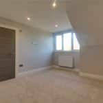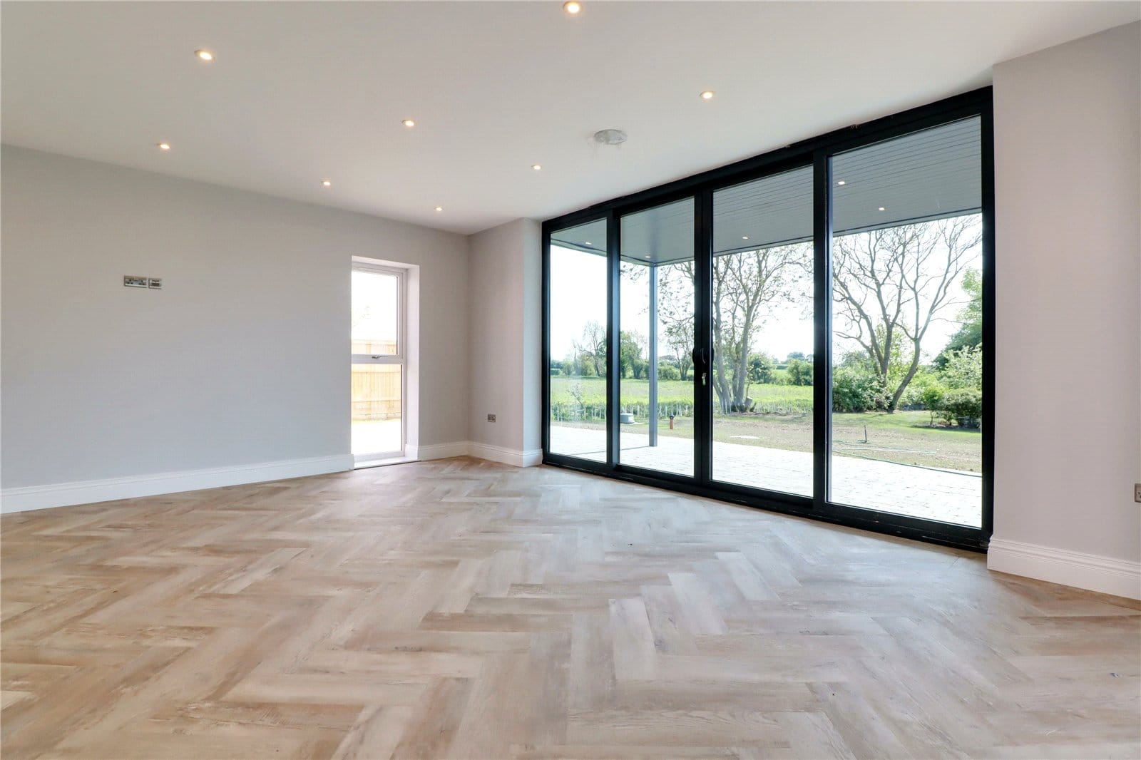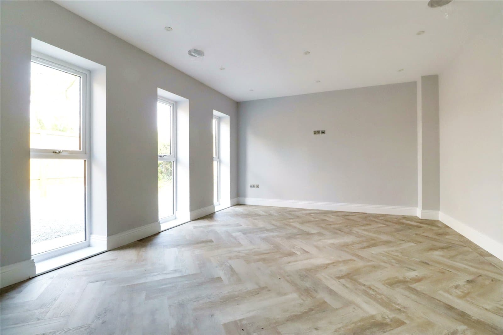 Three front facing uPVC double glazed windows, continuation of herringbone flooring with underfloor heating, inset ceiling spotlights and speakers and TV and telephone sockets.