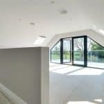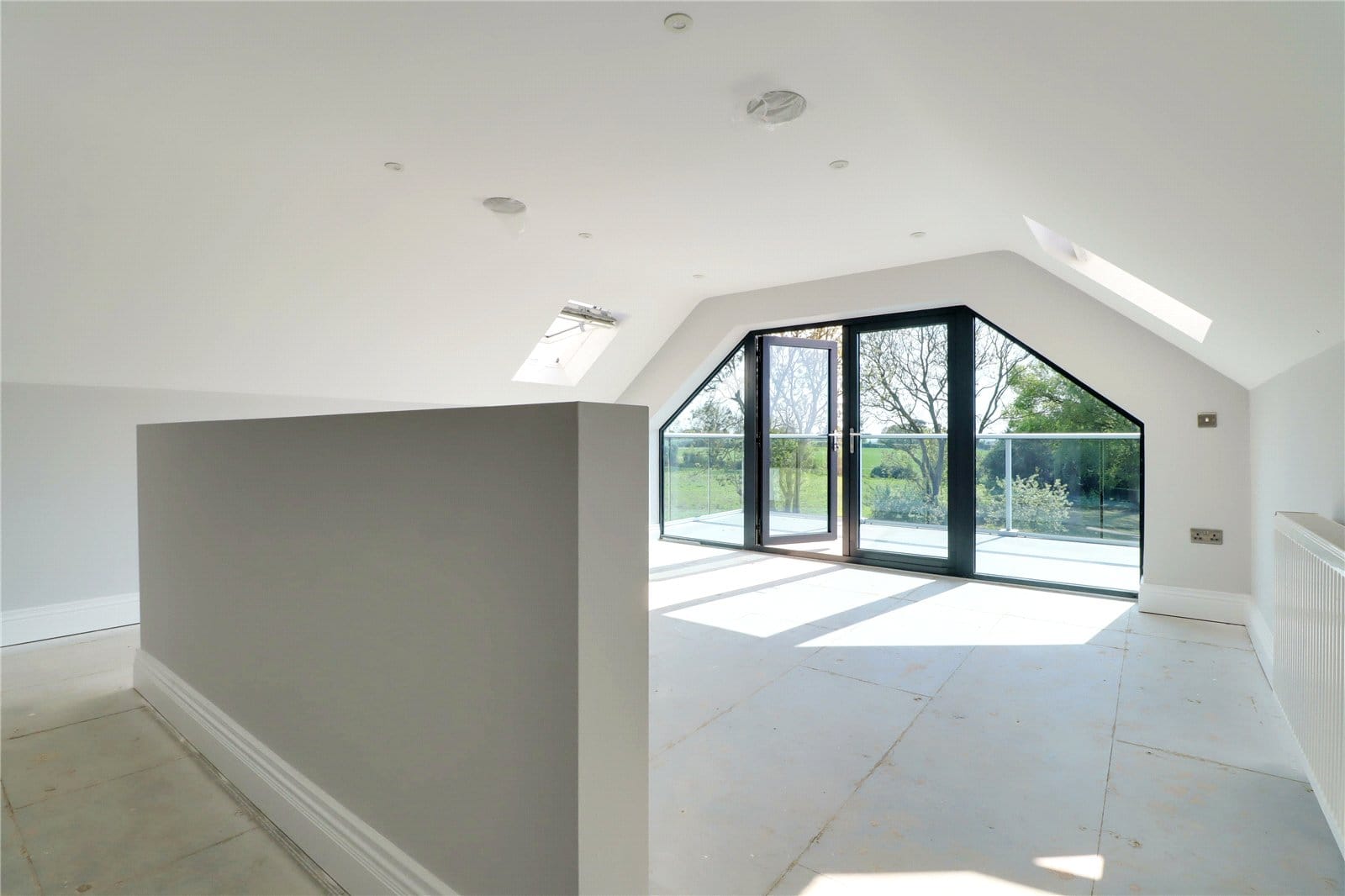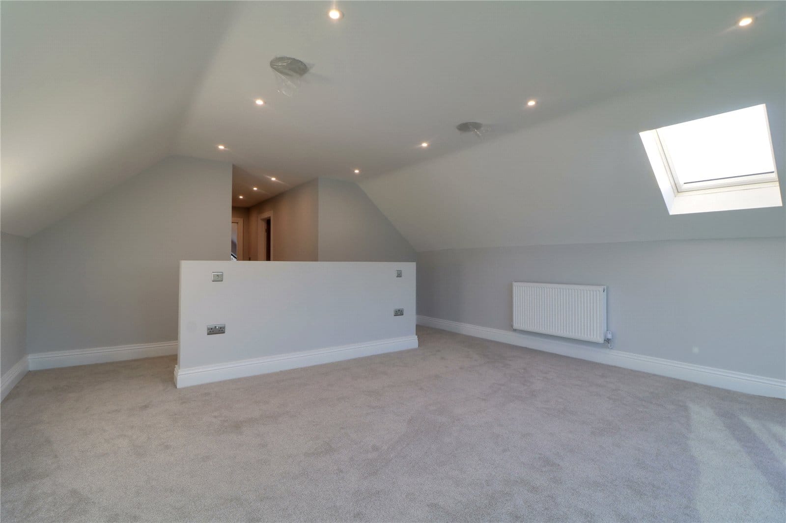 With twin side double glazed roof lights, rear double glazed French doors with adjoining side lights leads onto a balcony, inset ceiling spotlights and speaker.